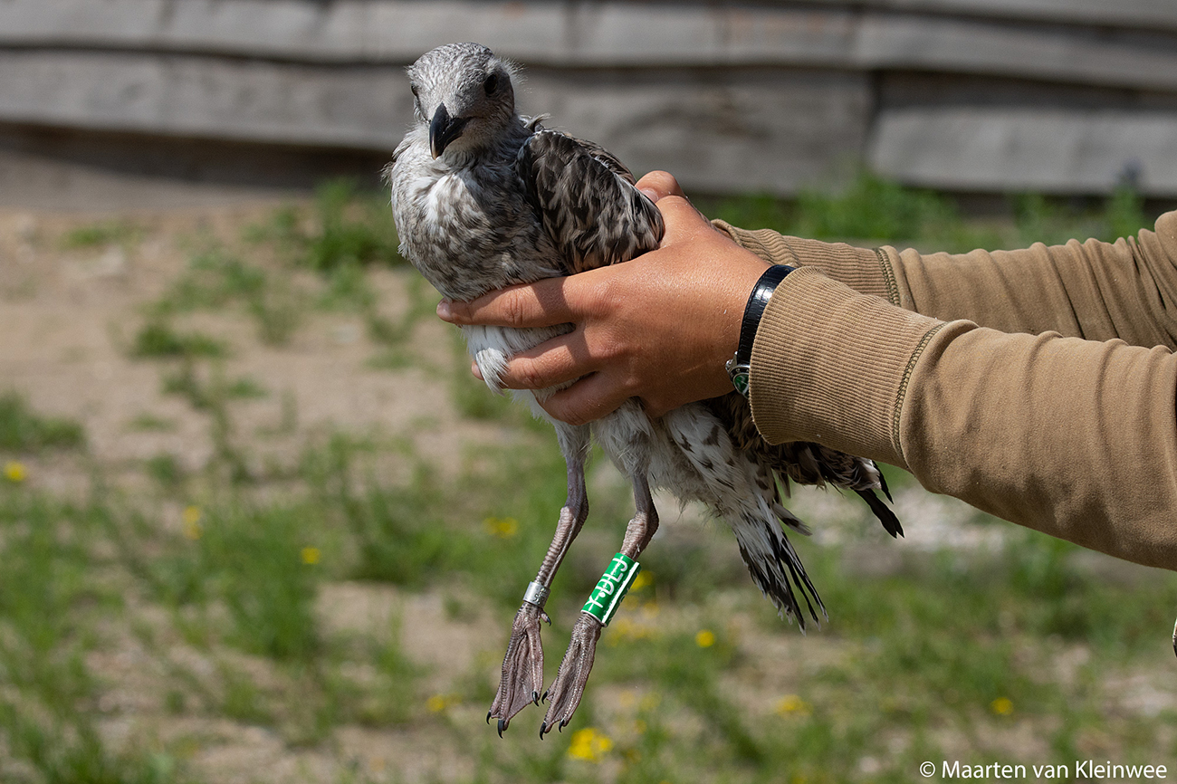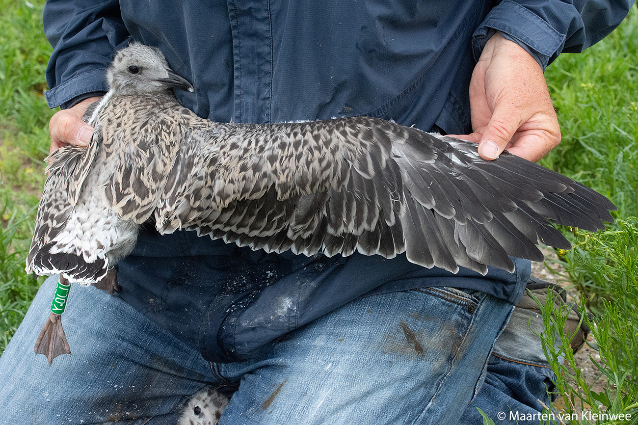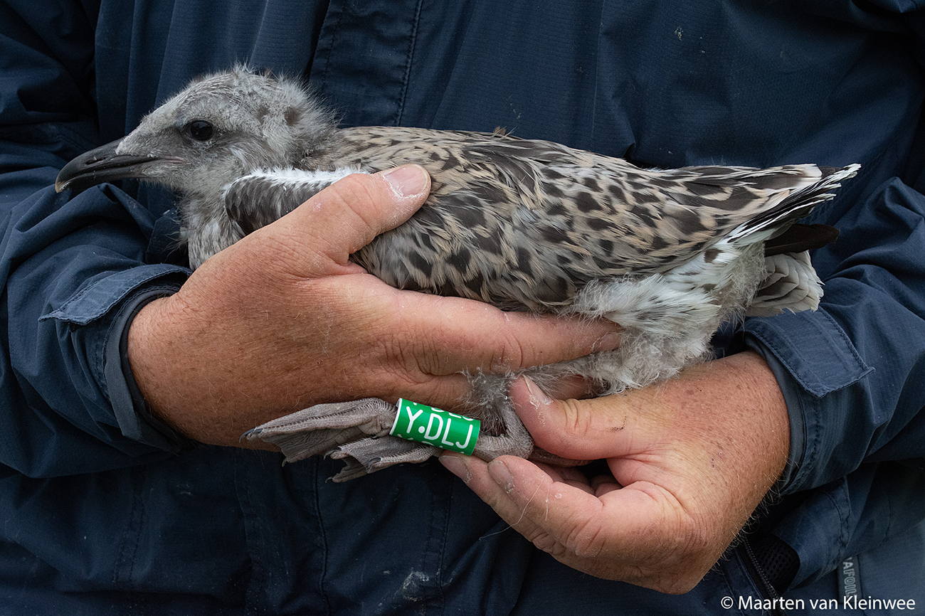 below: Lesser Black-backed Gull (graellsii) Y.DLJ 1CY, June 28 2021, IJmuiden, the Netherlands. Picture: Maarten van Kleinwee.