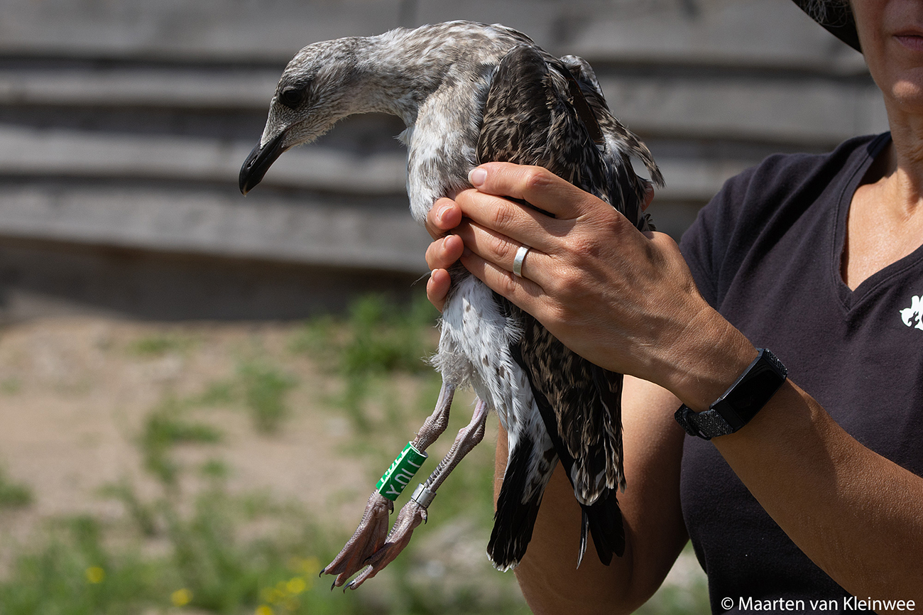 Lesser Black-backed Gull (graellsii) Y.DLL 1CY, 2021, IJmuiden, the Netherlands. Picture: IJmuiden ringing team.Ringed as pullus in breeding season 2021 at Forteiland, IJmuiden. Ringed by Fred Cottaar ringing team. Logger bird, GPS fitted in 2021: #7075. below: Lesser Black-backed Gull (graellsii) Y.DLL 1CY, July 02 2021, IJmuiden, the Netherlands. Picture: Maarten van Kleinwee.Logger fitted.