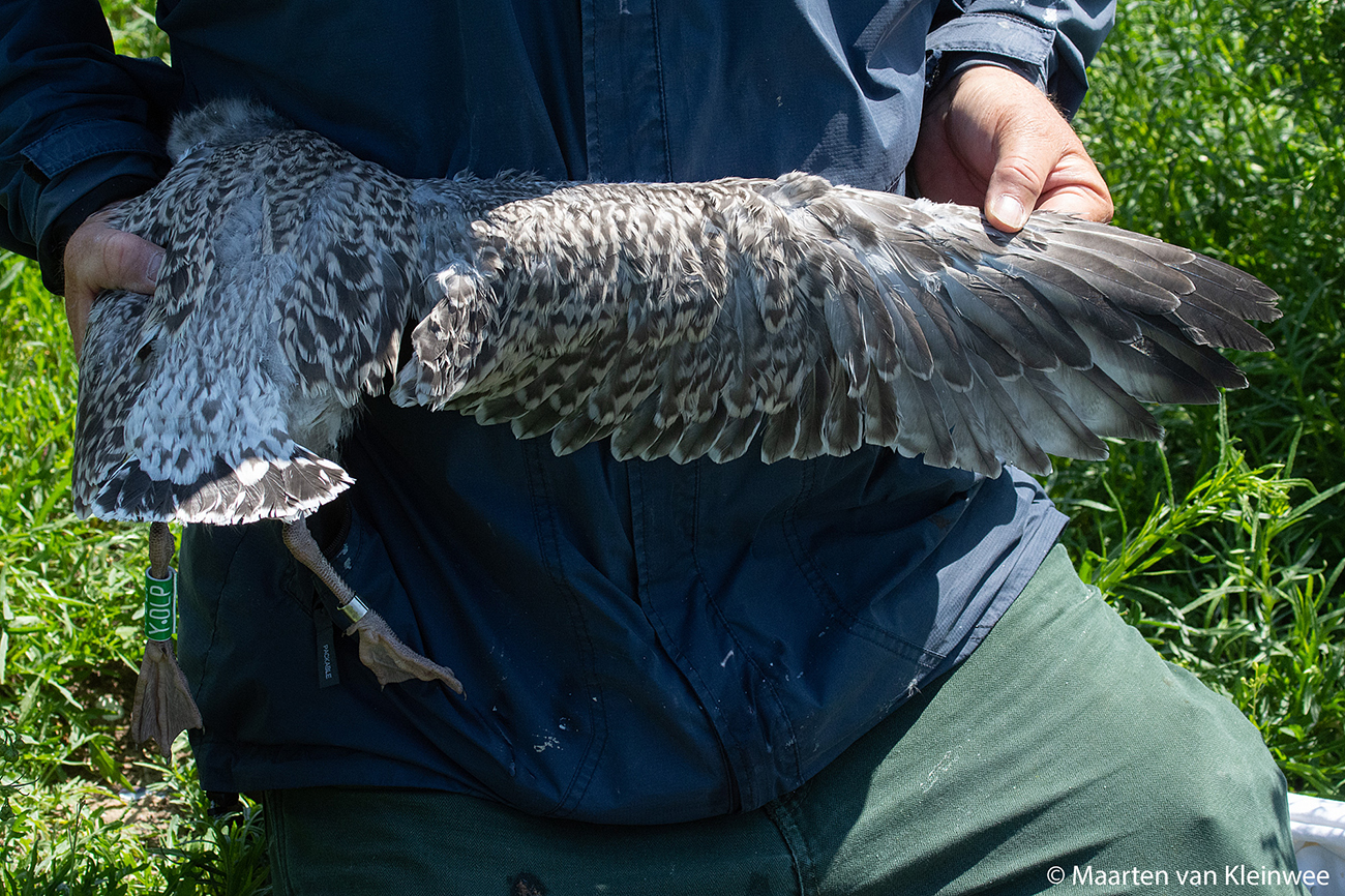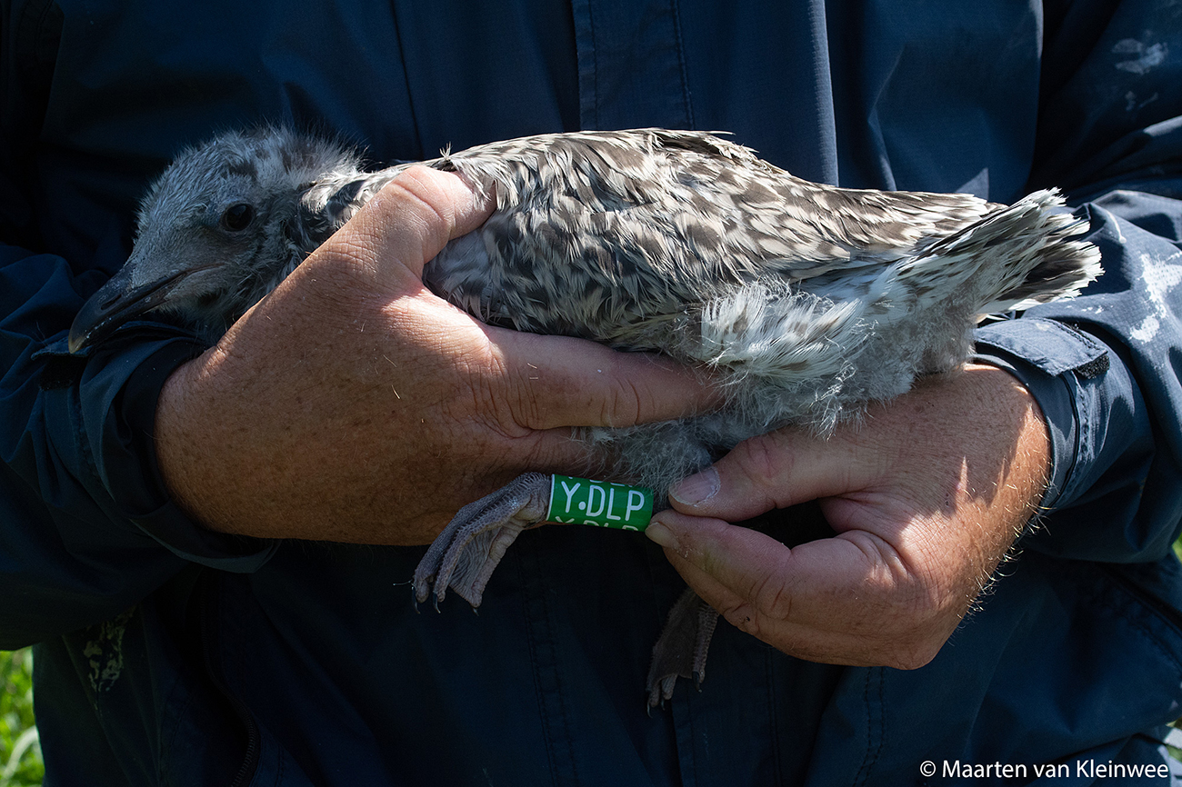 Herring Gull (argenteus) Y.DLP 1CY, 2021, IJmuiden, the Netherlands. Picture: IJmuiden ringing team.Ringed as pullus in breeding season 2021 at Forteiland, IJmuiden. Ringed by Fred Cottaar ringing team. Last observation: year 2021. below: Herring Gull (argenteus) Y.DLP 1CY, July 02 2021, IJmuiden, the Netherlands. Picture: Maarten van Kleinwee.