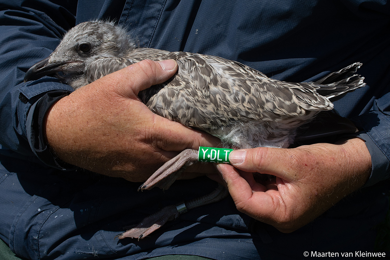 Herring Gull (argenteus) Y.DLT 1CY, 2021, IJmuiden, the Netherlands. Picture: IJmuiden ringing team.Ringed as pullus in breeding season 2021 at Forteiland, IJmuiden. Ringed by Fred Cottaar ringing team. below: Herring Gull (argenteus) Y.DLT 1CY, July 02 2021, IJmuiden, the Netherlands. Picture: Maarten van Kleinwee.