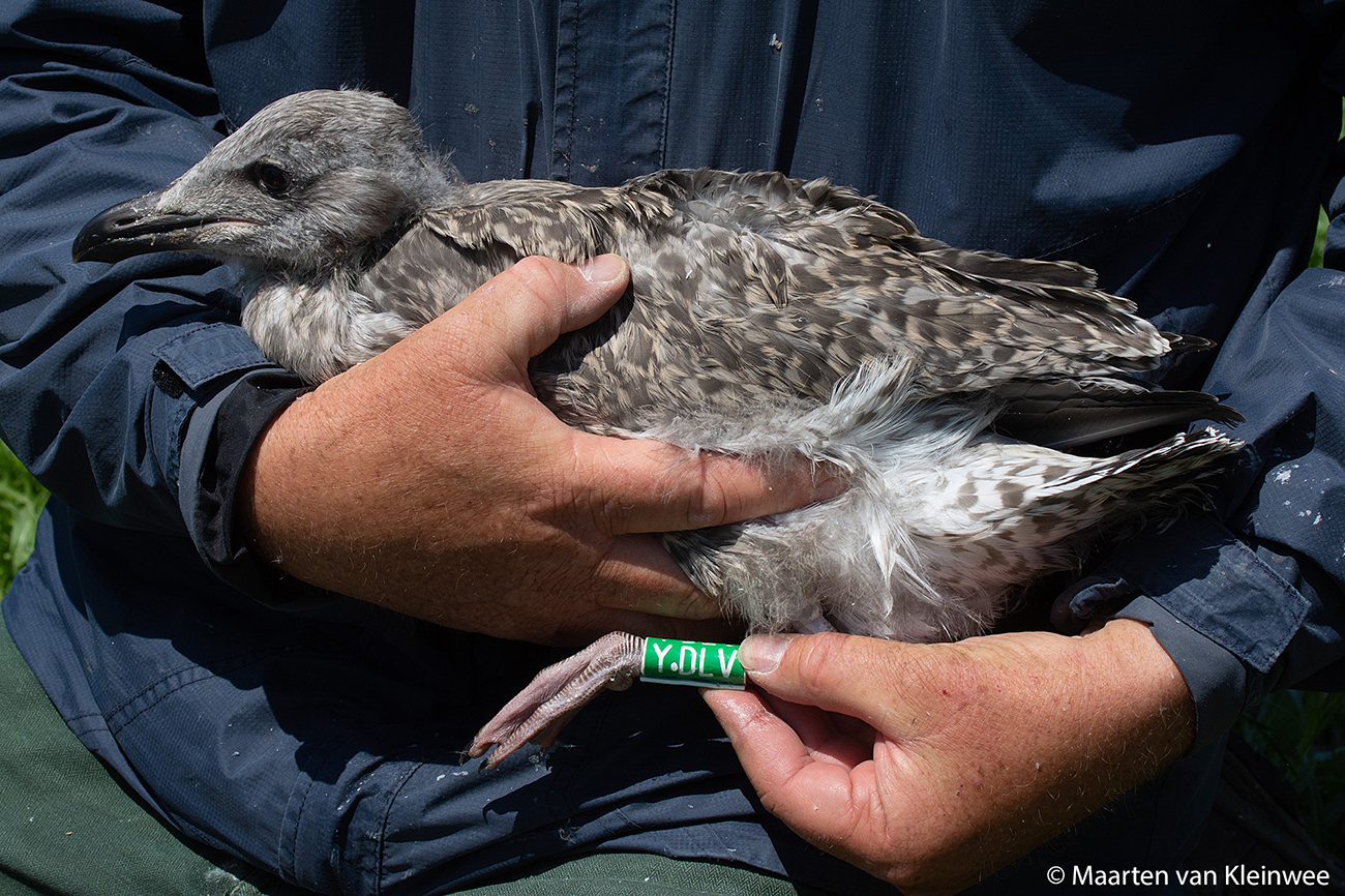 Herring Gull (argenteus) Y.DLV 1CY, 2021, IJmuiden, the Netherlands. Picture: IJmuiden ringing team.Ringed as pullus in breeding season 2021 at Forteiland, IJmuiden. Ringed by Fred Cottaar ringing team. below: Herring Gull (argenteus) Y.DLV 1CY, July 02 2021, IJmuiden, the Netherlands. Picture: Maarten van Kleinwee.
