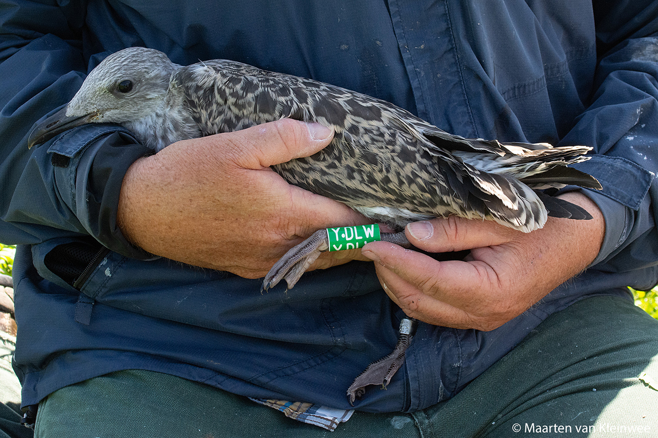 Lesser Black-backed Gull (graellsii) Y.DLW 1CY, 2021, IJmuiden, the Netherlands. Picture: IJmuiden ringing team.Ringed as pullus in breeding season 2021 at Forteiland, IJmuiden. Ringed by Fred Cottaar ringing team. below: Lesser Black-backed Gull (graellsii) Y.DLW 1CY, July 09 2021, IJmuiden, the Netherlands. Picture: Maarten van Kleinwee.