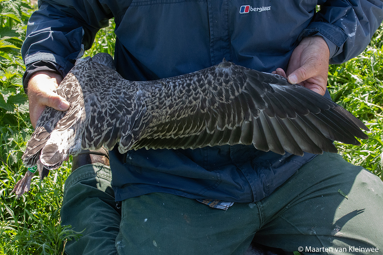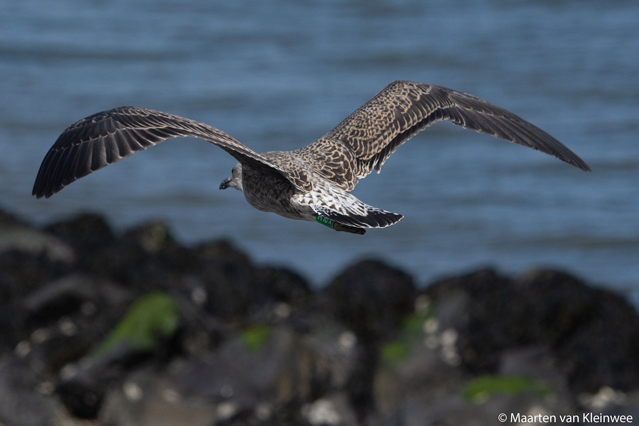 below: Lesser Black-backed Gull (graellsii) Y.DLW 1CY, July 02 2021, IJmuiden, the Netherlands. Picture: Maarten van Kleinwee.