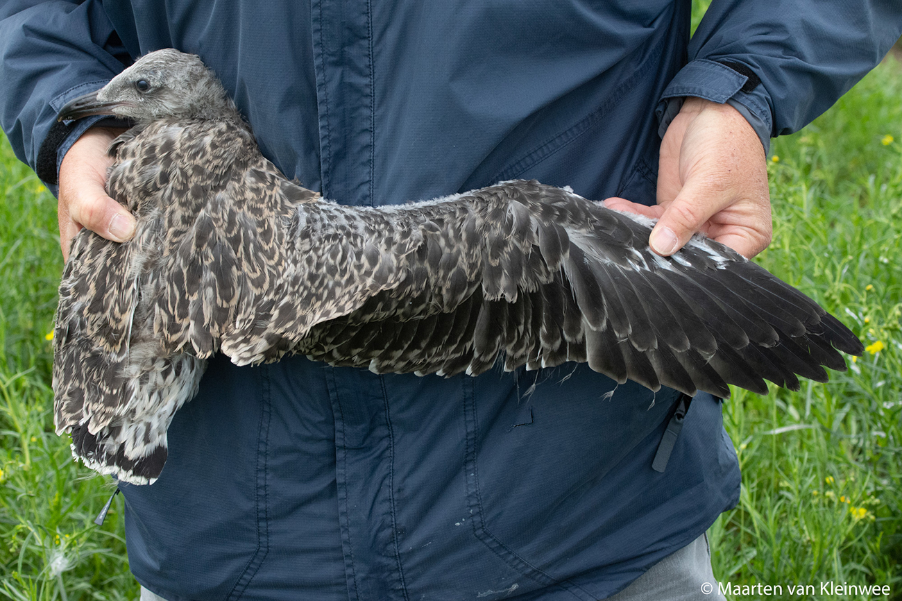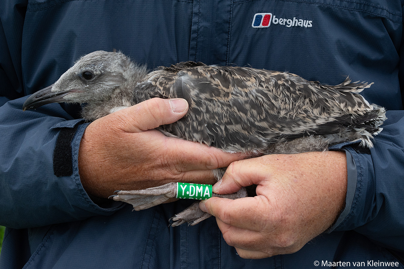 Lesser Black-backed Gull (graellsii) Y.DMA 1CY, 2021, IJmuiden, the Netherlands. Picture: IJmuiden ringing team.Ringed as pullus in breeding season 2021 at Forteiland, IJmuiden. Ringed by Fred Cottaar ringing team. below: Lesser Black-backed Gull (graellsii) Y.DMA 1CY, July 05 2021, IJmuiden, the Netherlands. Picture: Maarten van Kleinwee.