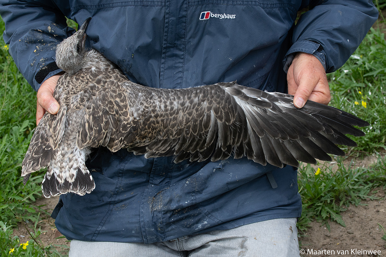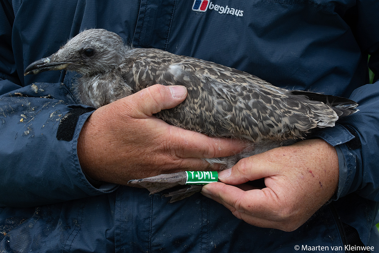 Lesser Black-backed Gull (graellsii) Y.DML 1CY, 2021, IJmuiden, the Netherlands. Picture: IJmuiden ringing team.Ringed as pullus in breeding season 2021 at Forteiland, IJmuiden. Ringed by Fred Cottaar ringing team. Last observation: season 2022. below: Lesser Black-backed Gull (graellsii) Y.DML 1CY, July 05 2021, IJmuiden, the Netherlands. Picture: Maarten van Kleinwee.