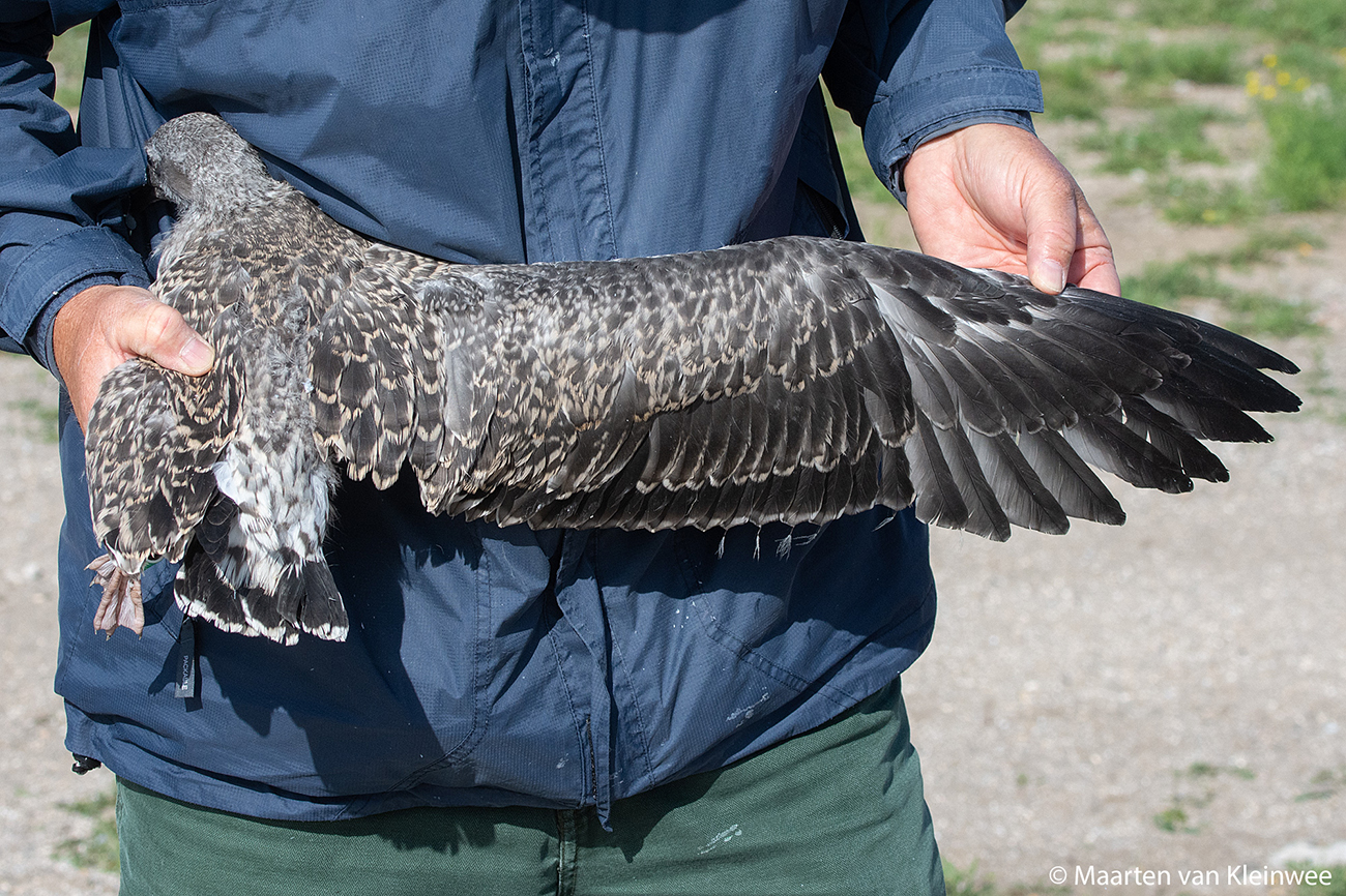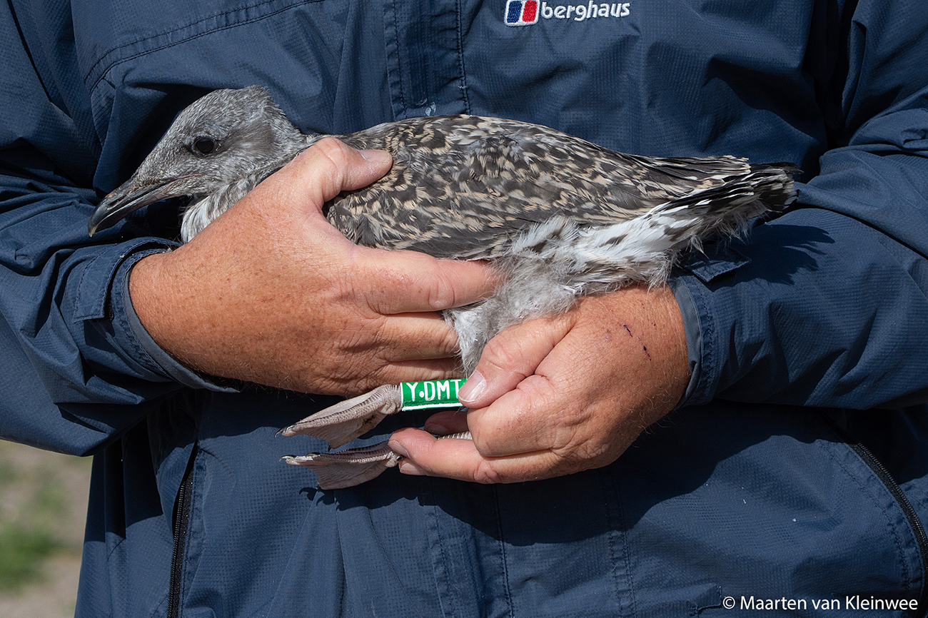 Lesser Black-backed Gull (graellsii) Y.DMT 1CY, 2021, IJmuiden, the Netherlands. Picture: IJmuiden ringing team.Ringed as pullus in breeding season 2021 at Forteiland, IJmuiden. Ringed by Fred Cottaar ringing team. Last observation: year 2021. below: Lesser Black-backed Gull (graellsii) Y.DMT 1CY, July 09 2021, IJmuiden, the Netherlands. Picture: Maarten van Kleinwee.