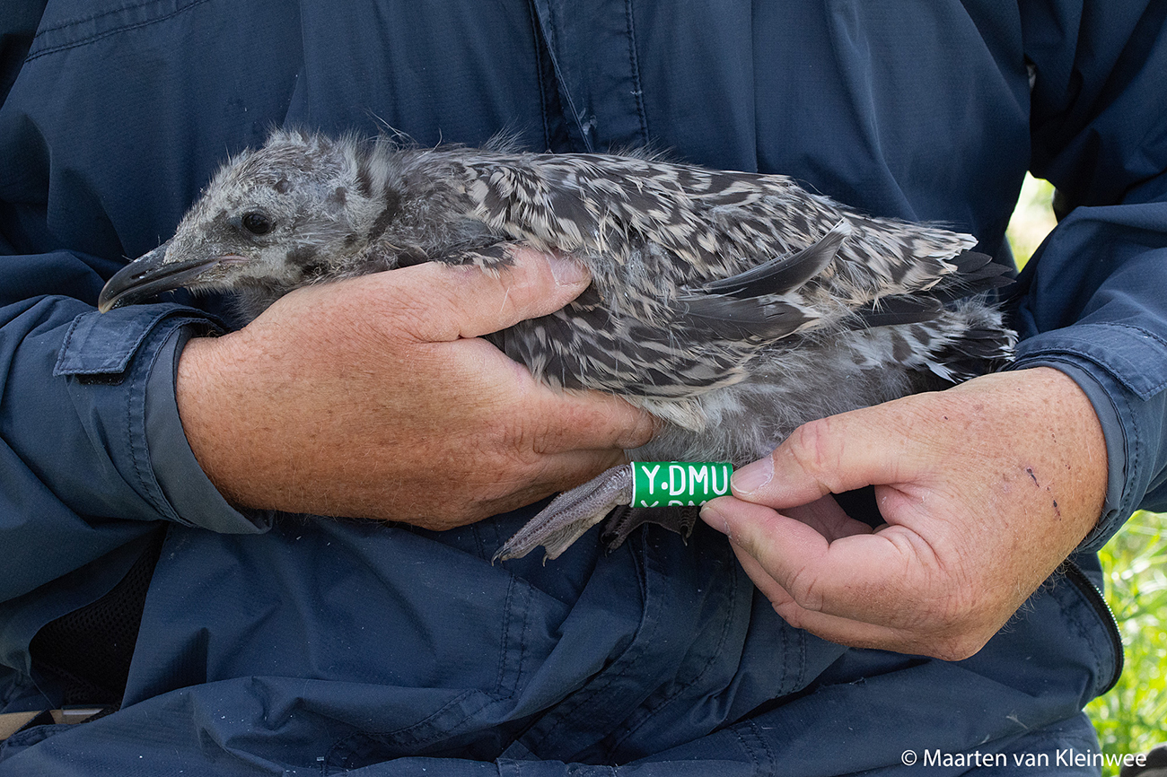 Lesser Black-backed Gull (graellsii) Y.DMU 1CY, 2021, IJmuiden, the Netherlands. Picture: IJmuiden ringing team.Ringed as pullus in breeding season 2021 at Forteiland, IJmuiden. Ringed by Fred Cottaar ringing team. Last observation: year 2021. below: Lesser Black-backed Gull (graellsii) Y.DMU 1CY, July 09 2021, IJmuiden, the Netherlands. Picture: Maarten van Kleinwee.