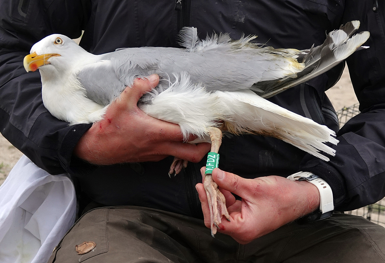 Herring Gull (argenteus) Y.FDZ adult, May 2025, IJmuiden, the Netherlands. Picture: IJmuiden Ringing Team.Ringed as breeding adult in season 2025 at Forteiland, IJmuiden. Ringed by Fred Cottaar ringing team. below: Herring Gull (argenteus) Y.FDZ >4CY, May 06 2025, IJmuiden, the Netherlands. Picture: IJmuiden Ringing Team.Trapped on nest with 3 eggs. |