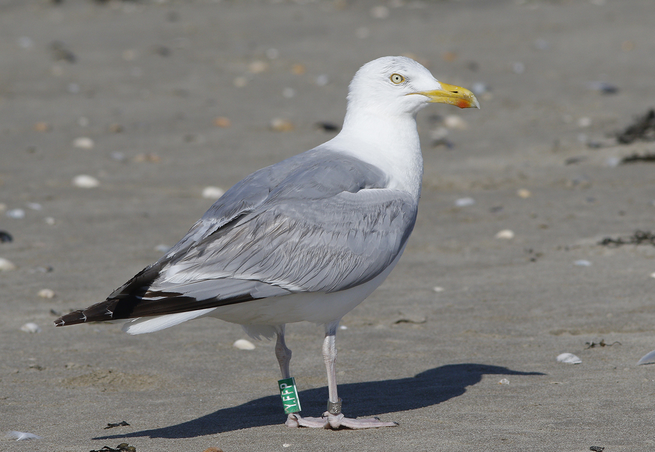 Herring Gull (argenteus) Y.FFP adult, 2025, IJmuiden, the Netherlands. Picture: IJmuiden Ringing Team.Ringed as breeding adult in season 2025 at Forteiland, IJmuiden. Ringed by Fred Cottaar ringing team. below: Herring Gull (argenteus) Y.FFP >4CY, July 29 2025, IJmuiden, the Netherlands. Picture: Mars Muusse.