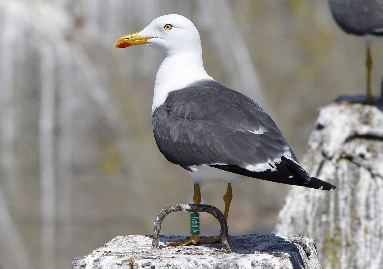 Lesser Black-backed Gull (graellsii) Y.FFV adult, 2025, IJmuiden, the Netherlands. Picture: IJmuiden Ringing Team.Ringed as breeding adult in season 2025 at Forteiland, IJmuiden. Ringed by Fred Cottaar ringing team. below: Lesser Black-backed Gull (graellsii) Y.FFV >4CY, May 20 2025, IJmuiden, the Netherlands. Picture: IJmuiden Ringing Team.