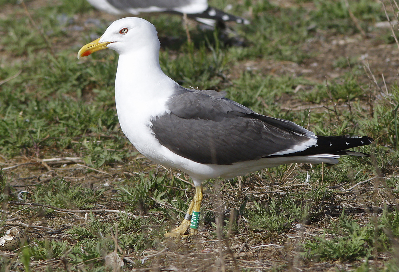 below: Lesser Black-backed Gull (graellsii) Y.FHP >4CY, May 12 2025, IJmuiden, the Netherlands. Picture: IJmuiden Ringing Team.Nest with 3 eggs.