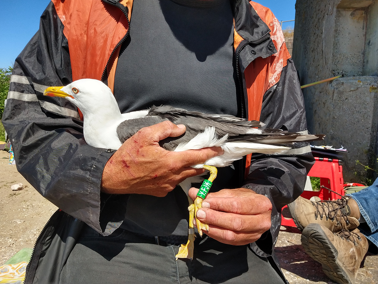 Lesser Black-backed Gull (graellsii) Y.FJK adult, May 12 2025, IJmuiden, the Netherlands. Picture: IJmuiden Ringing Team.Ringed as breeding adult in season 2025 at Forteiland, IJmuiden. Ringed by Fred Cottaar ringing team. below: Lesser Black-backed Gull (graellsii) Y.FJK >4CY, May 12 2025, IJmuiden, the Netherlands. Picture: IJmuiden Ringing Team.Nest with 3 eggs.