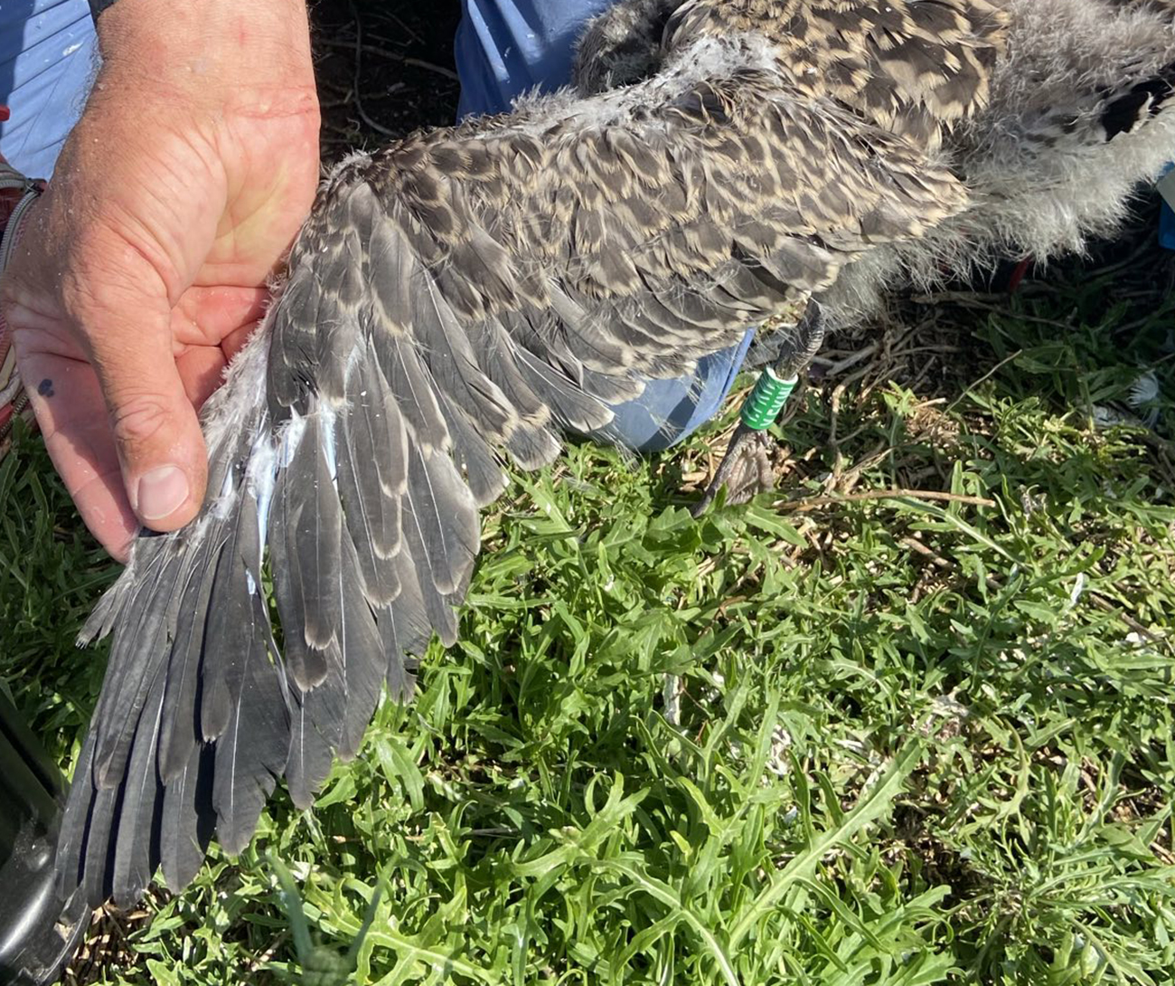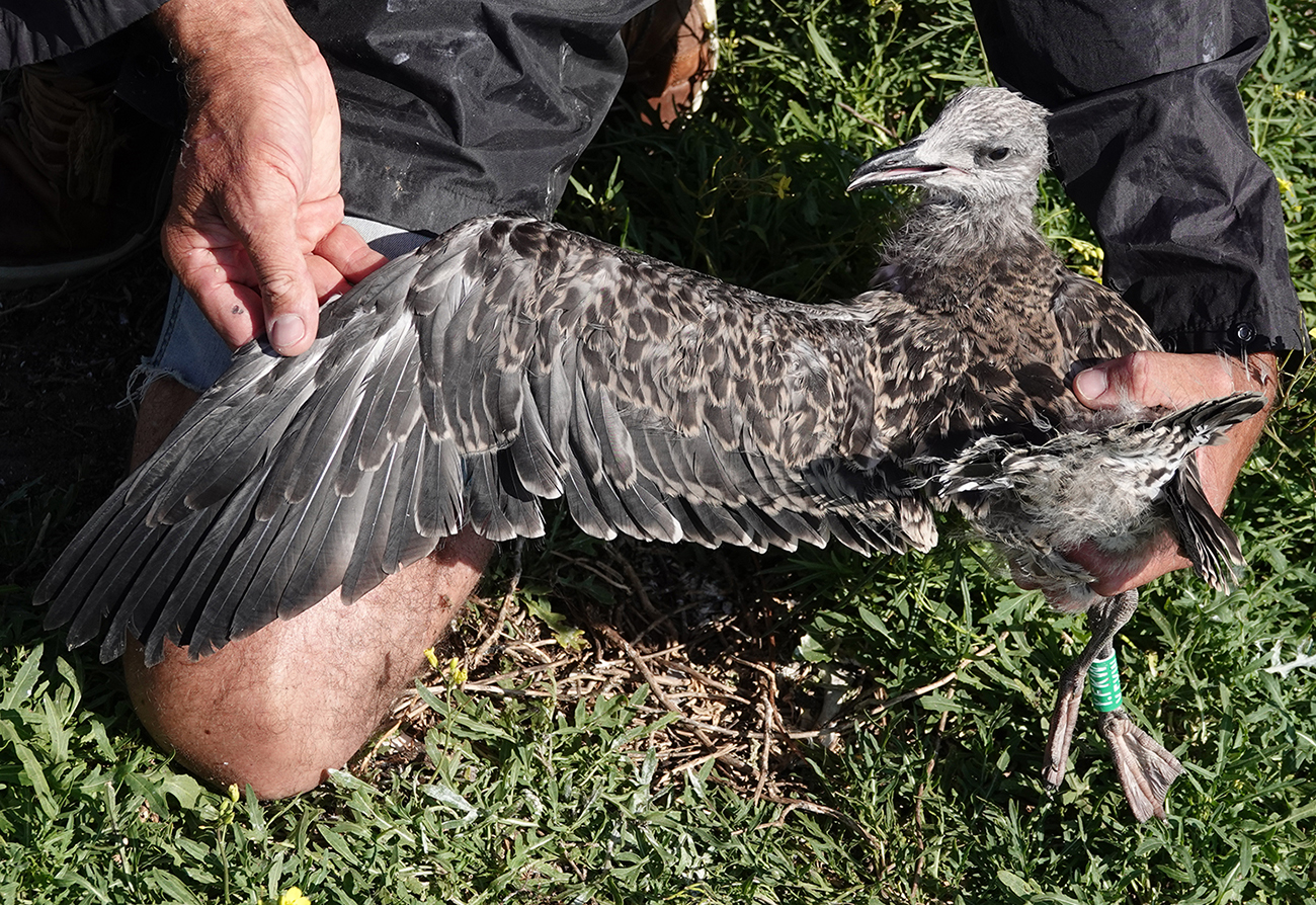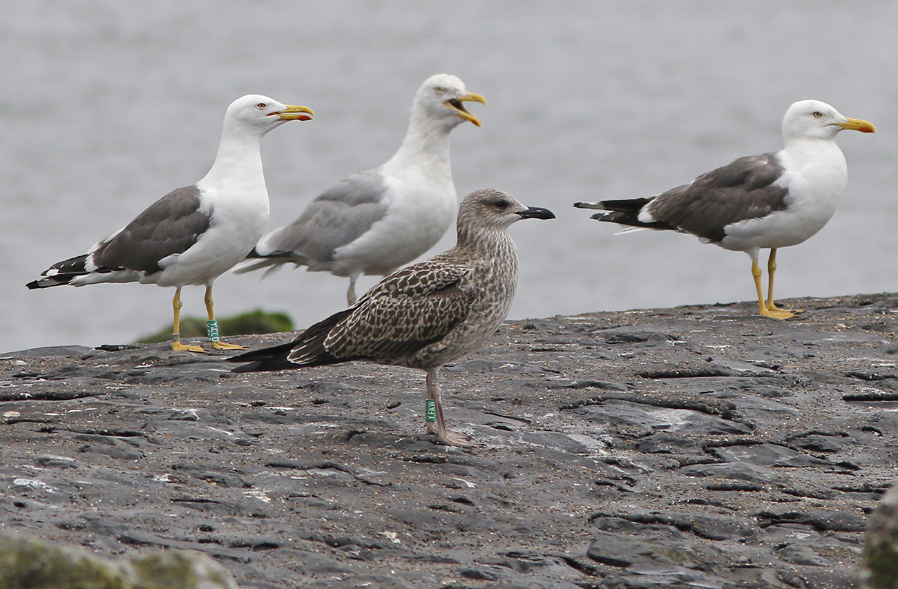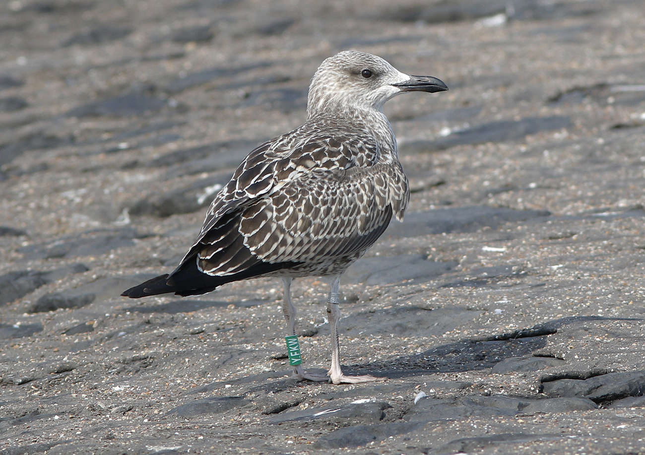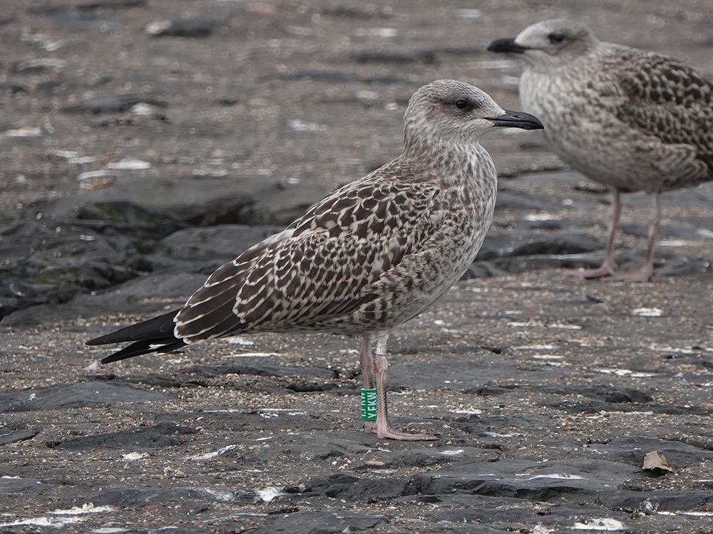 below: Lesser Black-backed Gull (graellsii) hybrid Y.FKW 1CY, June 13 2025, IJmuiden, the Netherlands. Picture: IJmuiden Ringing Team.This was the first plastic ring used on juveniles in season 2025.