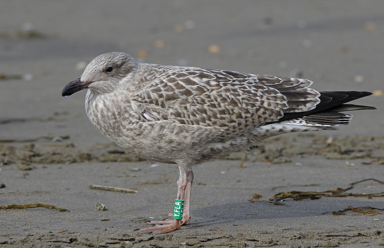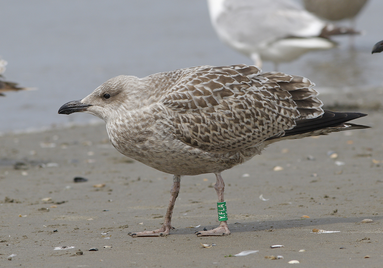 Herring Gull (argenteus) Y.FLA 1CY, 2025, IJmuiden, the Netherlands. Picture: IJmuiden Ringing Team.Ringed as 1CY male on July 30 2025 at Velsen-Noord beach. Ringed by Fred Cottaar ringing team. below: Herring Gull (argenteus) Y.FLA 1CY, September 30 2025, IJmuiden, the Netherlands. Picture: Mars Muusse.