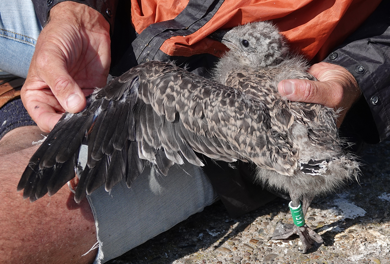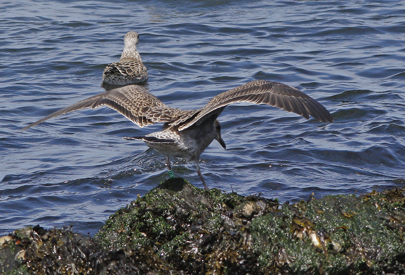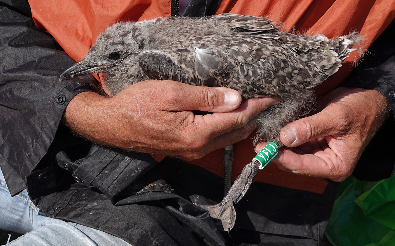 below: Lesser Black-backed Gull (graellsii) Y.FLJ 1CY, June 20 2025, IJmuiden, the Netherlands. Picture: IJmuiden Ringing Team.