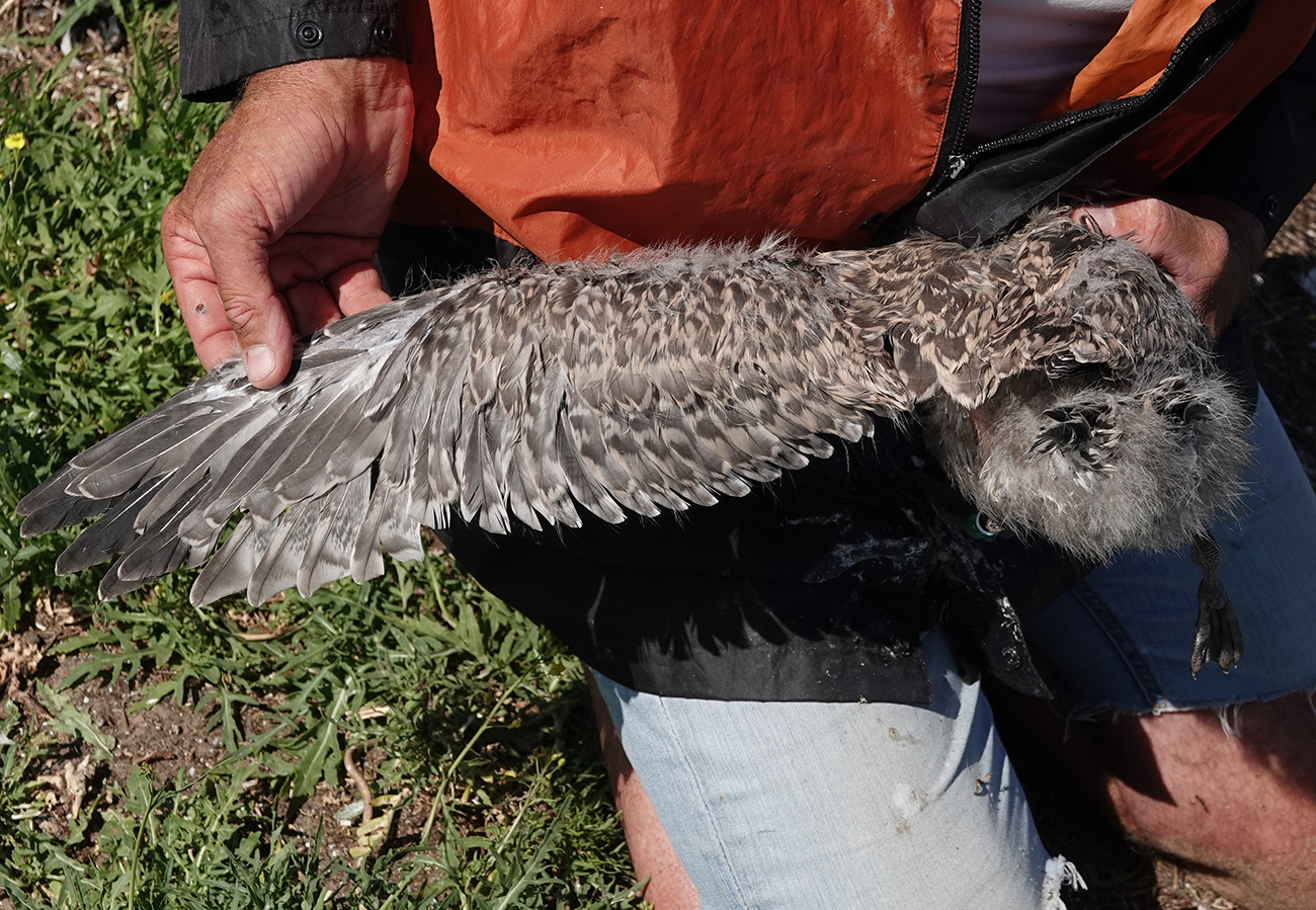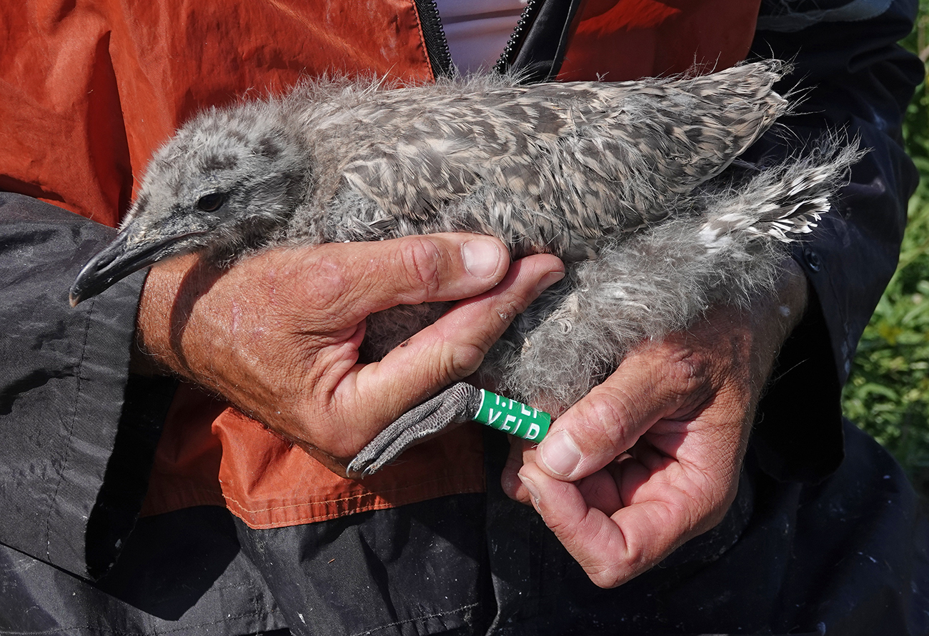 Herring Gull (argenteus) Y.FLP 1CY, 2025, IJmuiden, the Netherlands. Picture: IJmuiden Ringing Team.Ringed as pullus on June 03 2025, at Forteiland. Colour ring added on June 20 2025. Ringed by Fred Cottaar ringing team. below: Herring Gull (argenteus) Y.FLP 1CY, June 20 2025, IJmuiden, the Netherlands. Picture: IJmuiden Ringing Team.