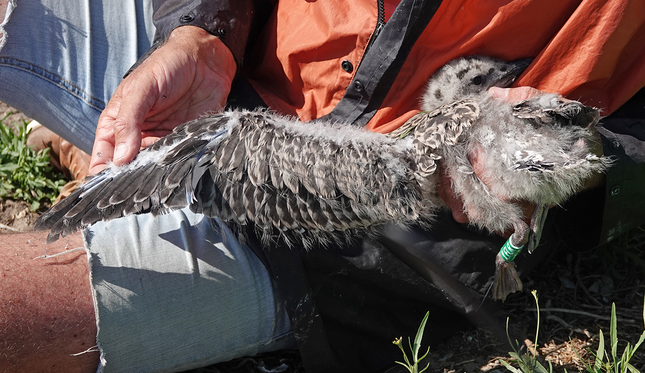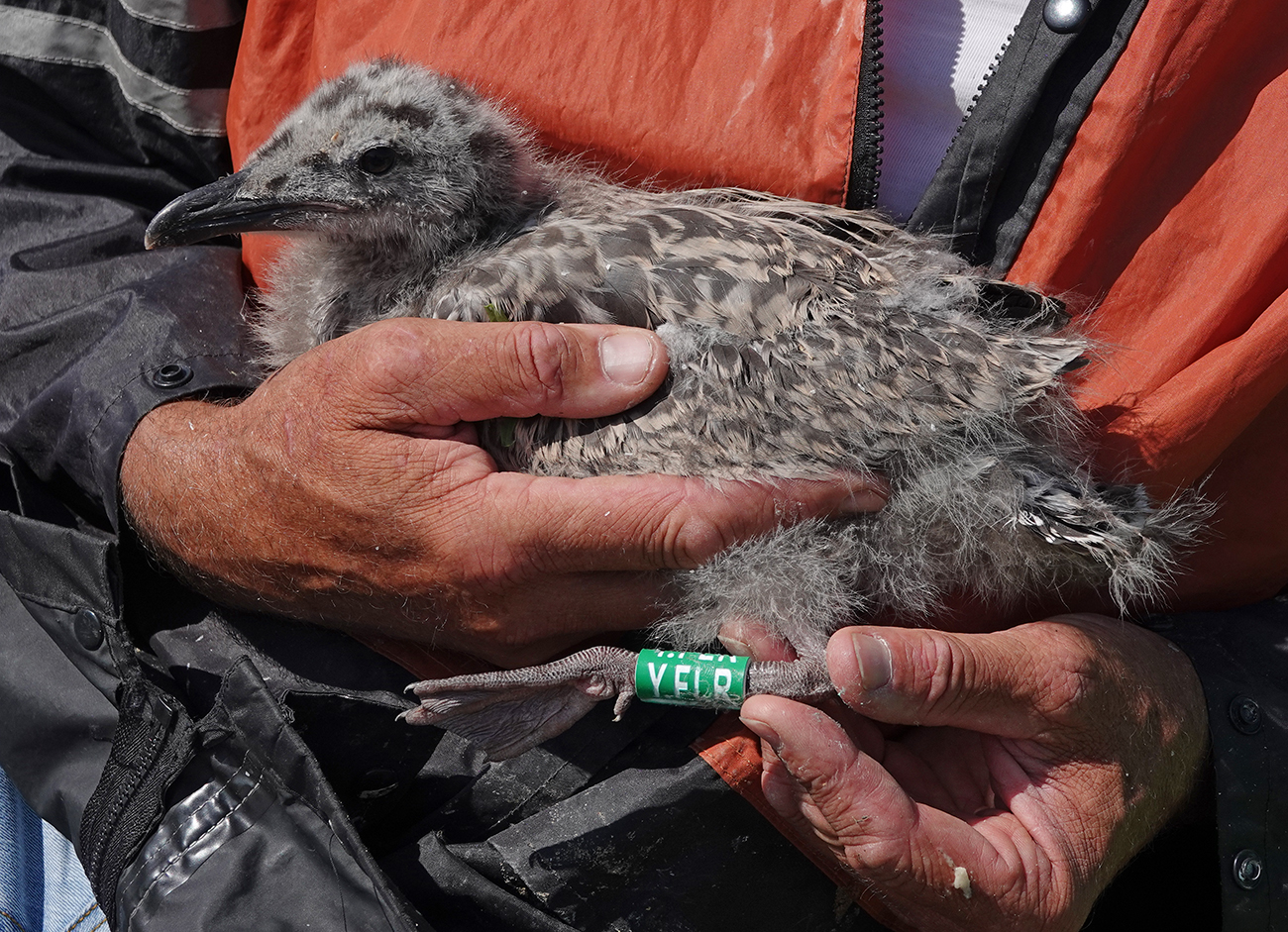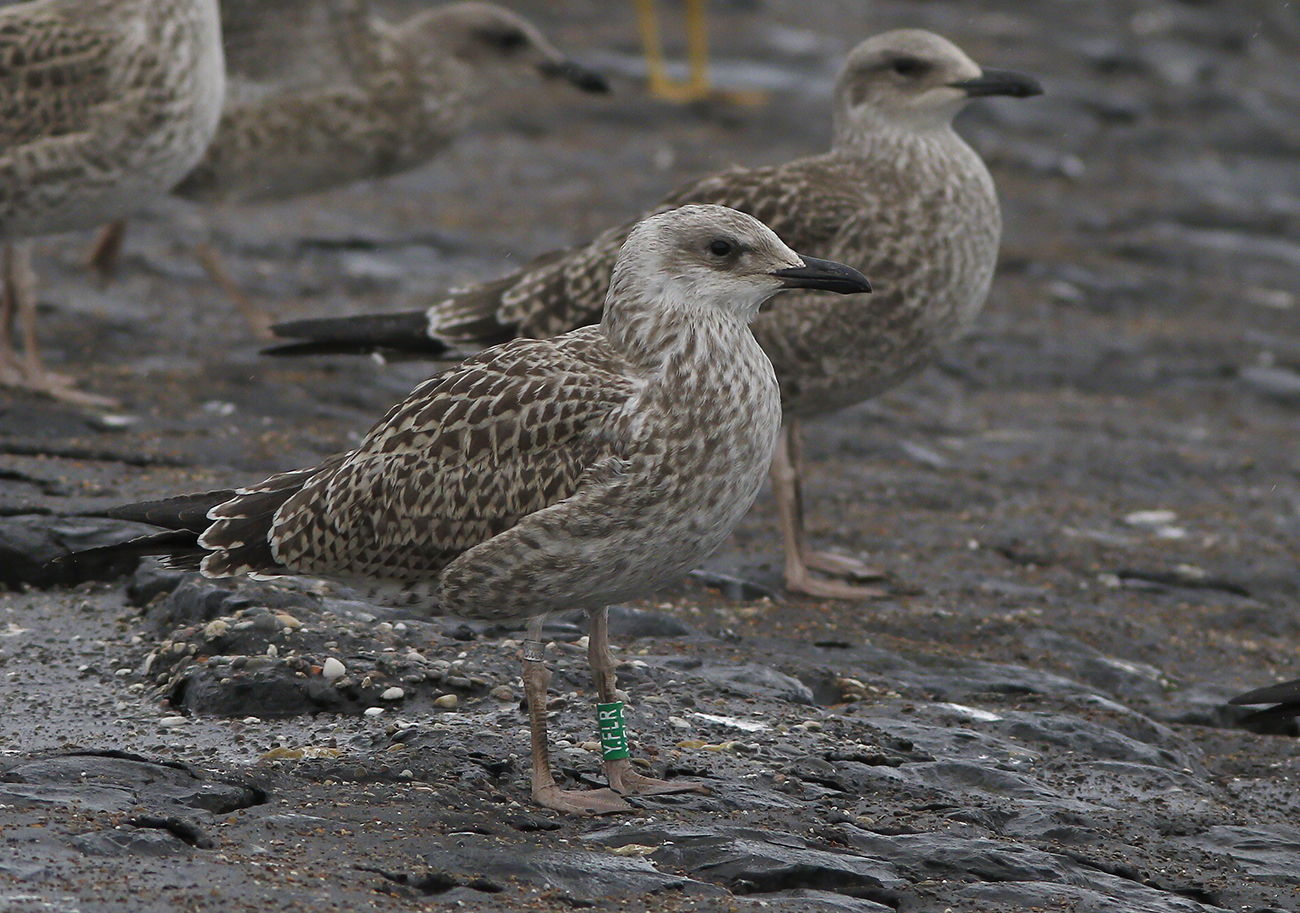 below: Lesser Black-backed Gull (graellsii) hybrid Y.FLR 1CY, June 20 2025, IJmuiden, the Netherlands. Picture: IJmuiden Ringing Team.