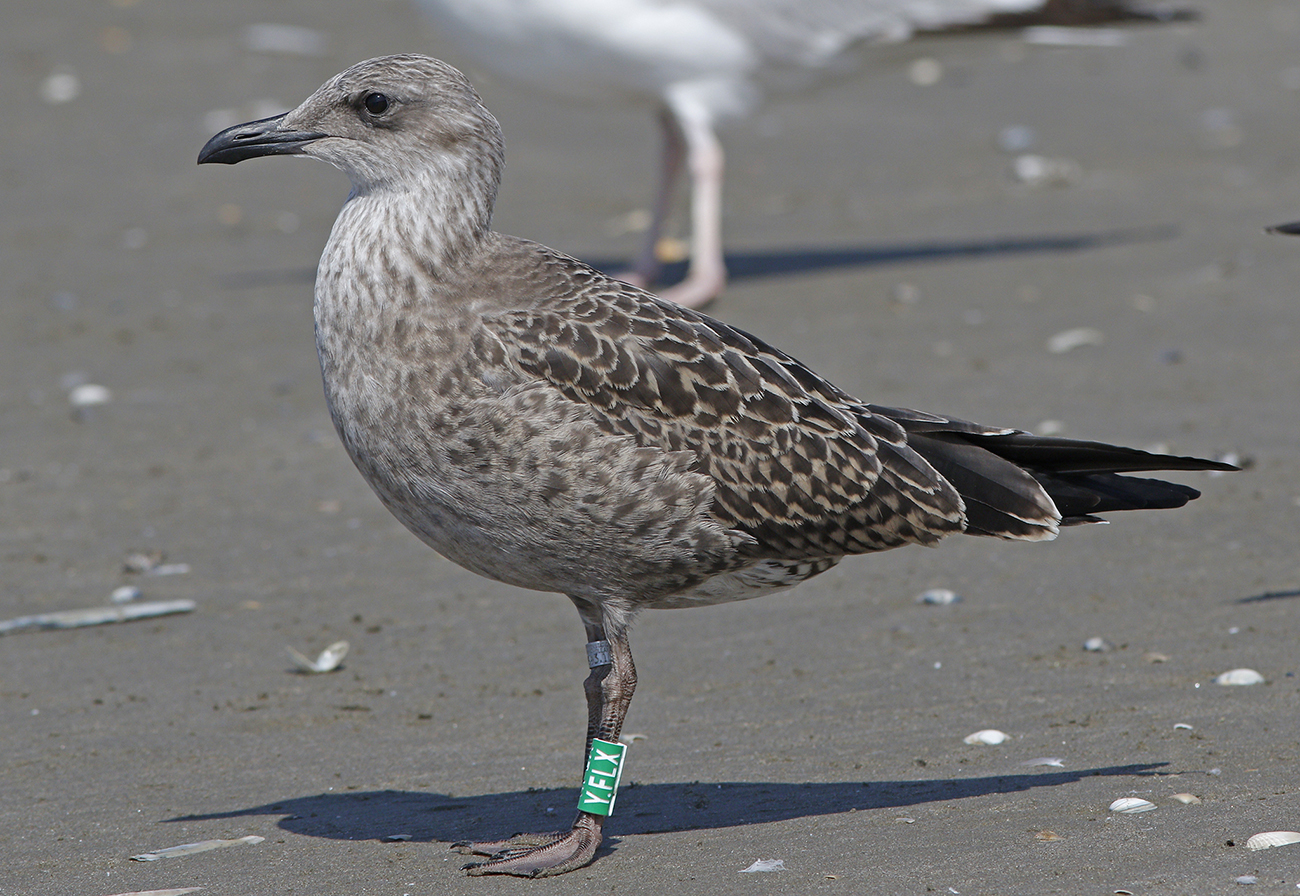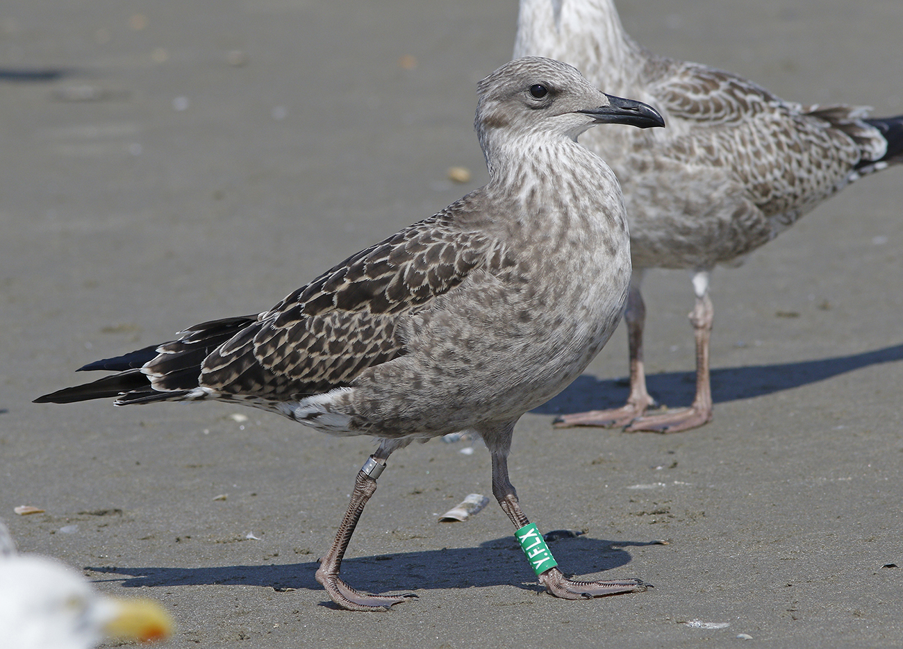 below: Lesser Black-backed Gull (graellsii) Y.FLX 1CY, July 11 2025, IJmuiden, the Netherlands. Picture: Ruud Altenburg.
