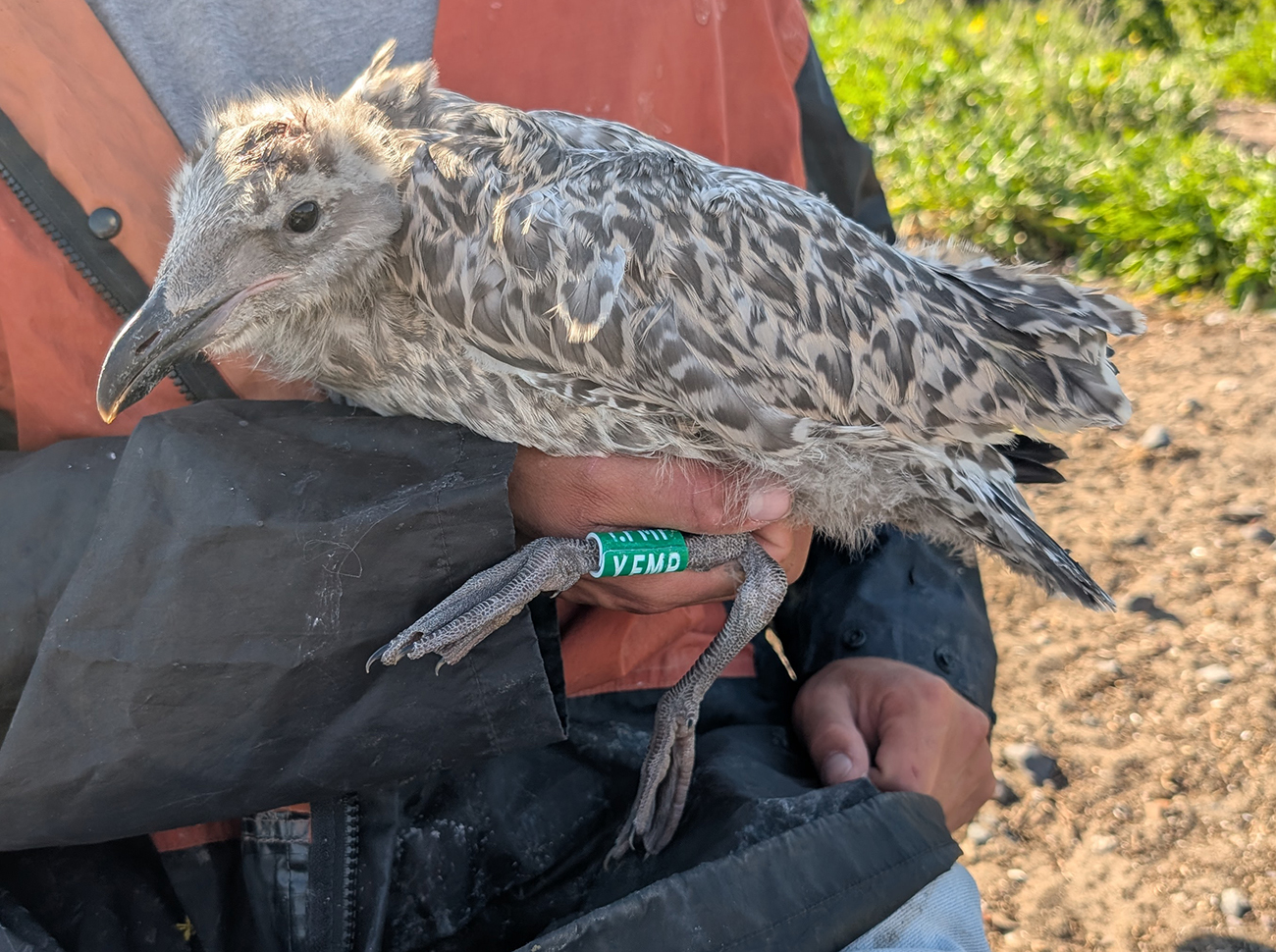 Herring Gull (argenteus) Y.FMP 1CY, 2025, IJmuiden, the Netherlands. Picture: IJmuiden Ringing Team.Ringed as pullus on June 03 2025, at Forteiland. Colour ring added on July 04 2025. Ringed by Fred Cottaar ringing team. below: Herring Gull (argenteus) Y.FMP 1CY, July 04 2025, IJmuiden, the Netherlands. Picture: IJmuiden Ringing Team.