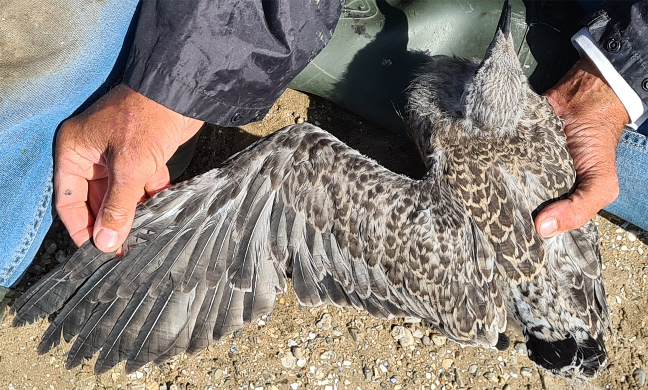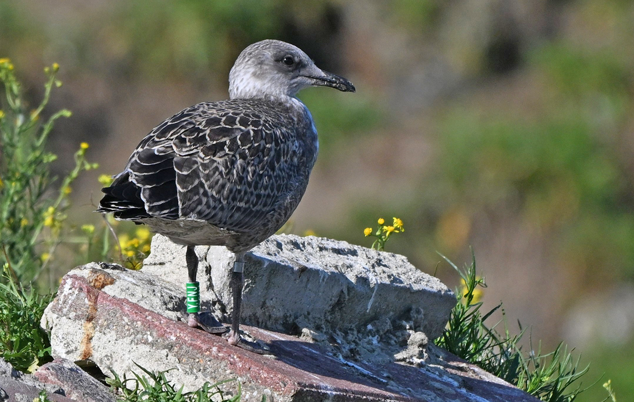Lesser Black-backed Gull (graellsii) Y.FNJ 1CY, 2025, IJmuiden, the Netherlands. Picture: IJmuiden Ringing Team.Ringed as pullus on June 23 2025, at Forteiland. Ringed by Fred Cottaar ringing team. below: Lesser Black-backed Gull (graellsii) Y.FNJ 1CY, July 18 2025, IJmuiden, the Netherlands. Picture: Ruud Altenburg.
