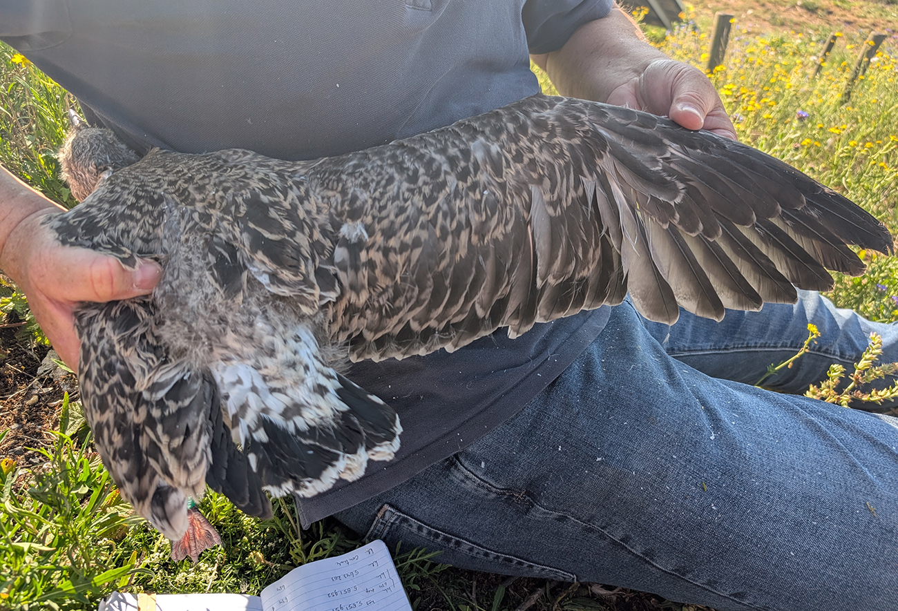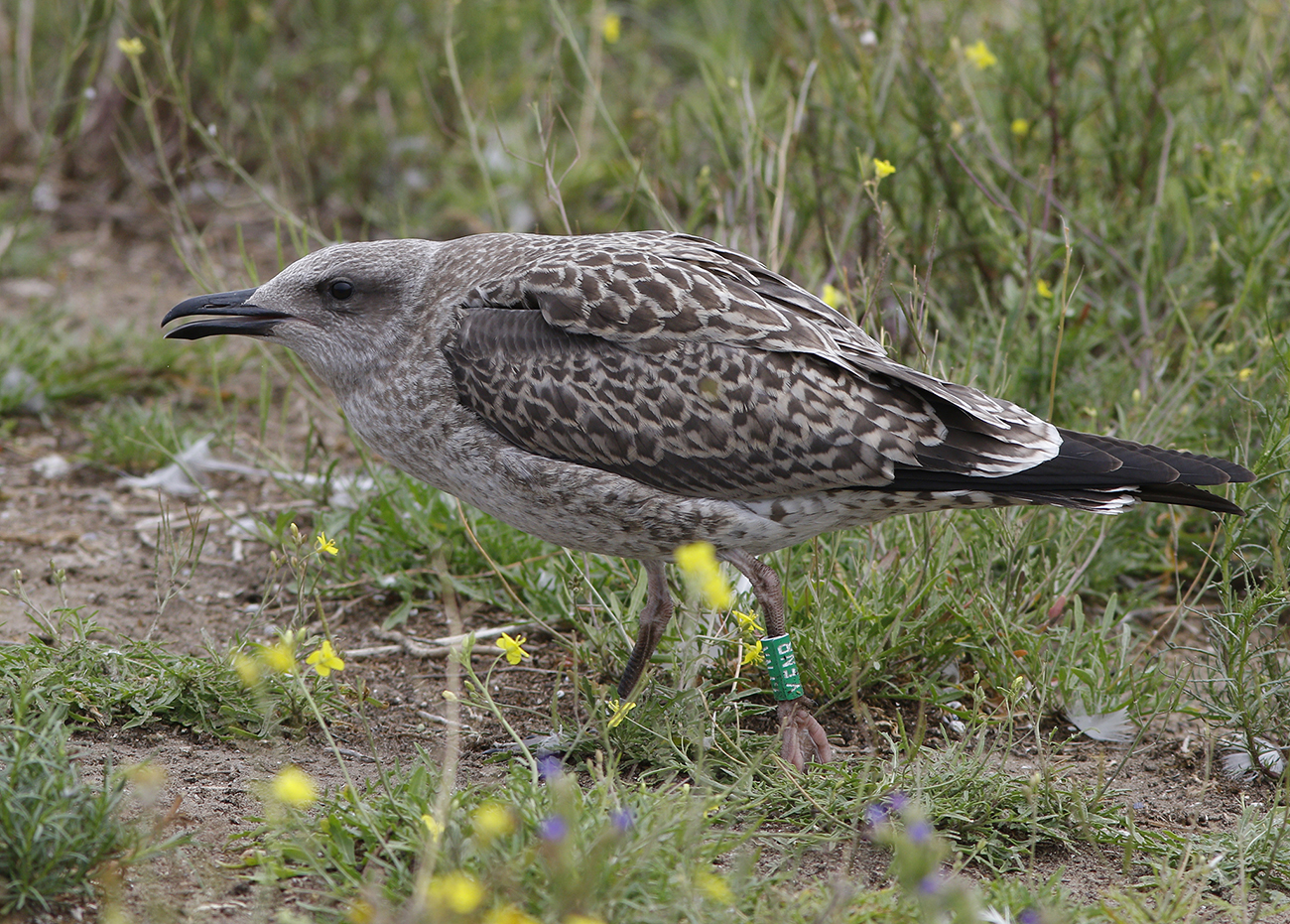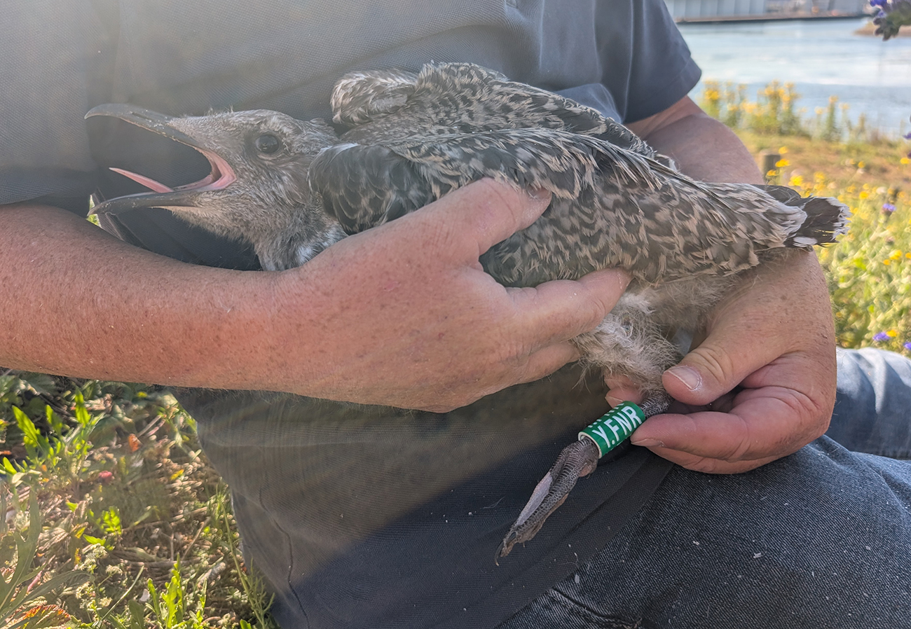below: Lesser Black-backed Gull (graellsii) Y.FNR 1CY, July 01 2025, IJmuiden, the Netherlands. Picture: IJmuiden Ringing Team.