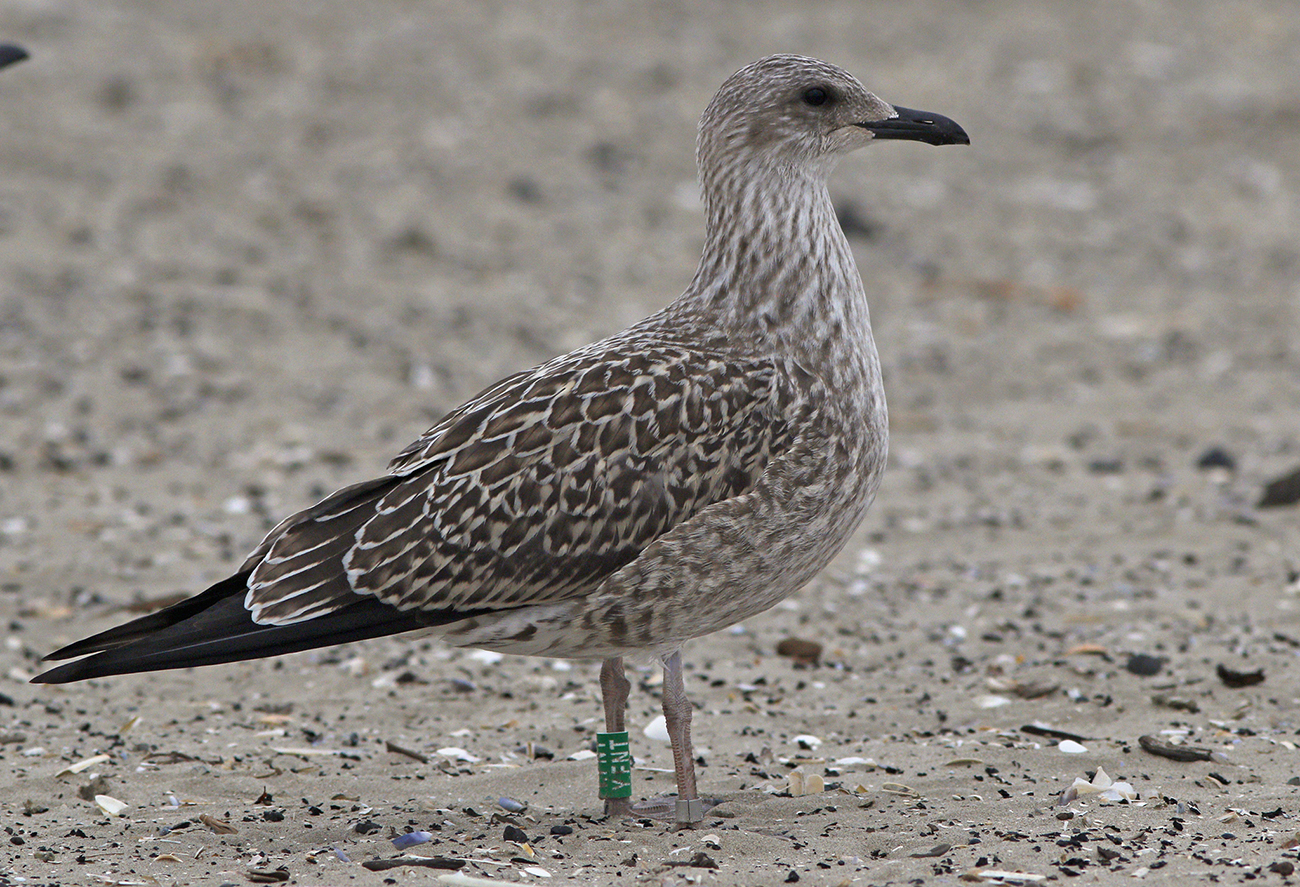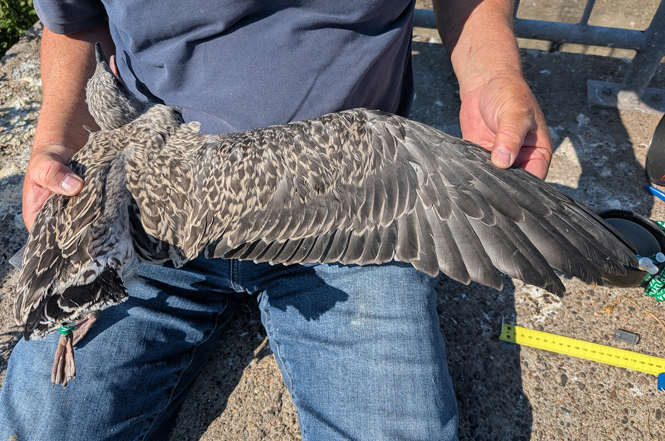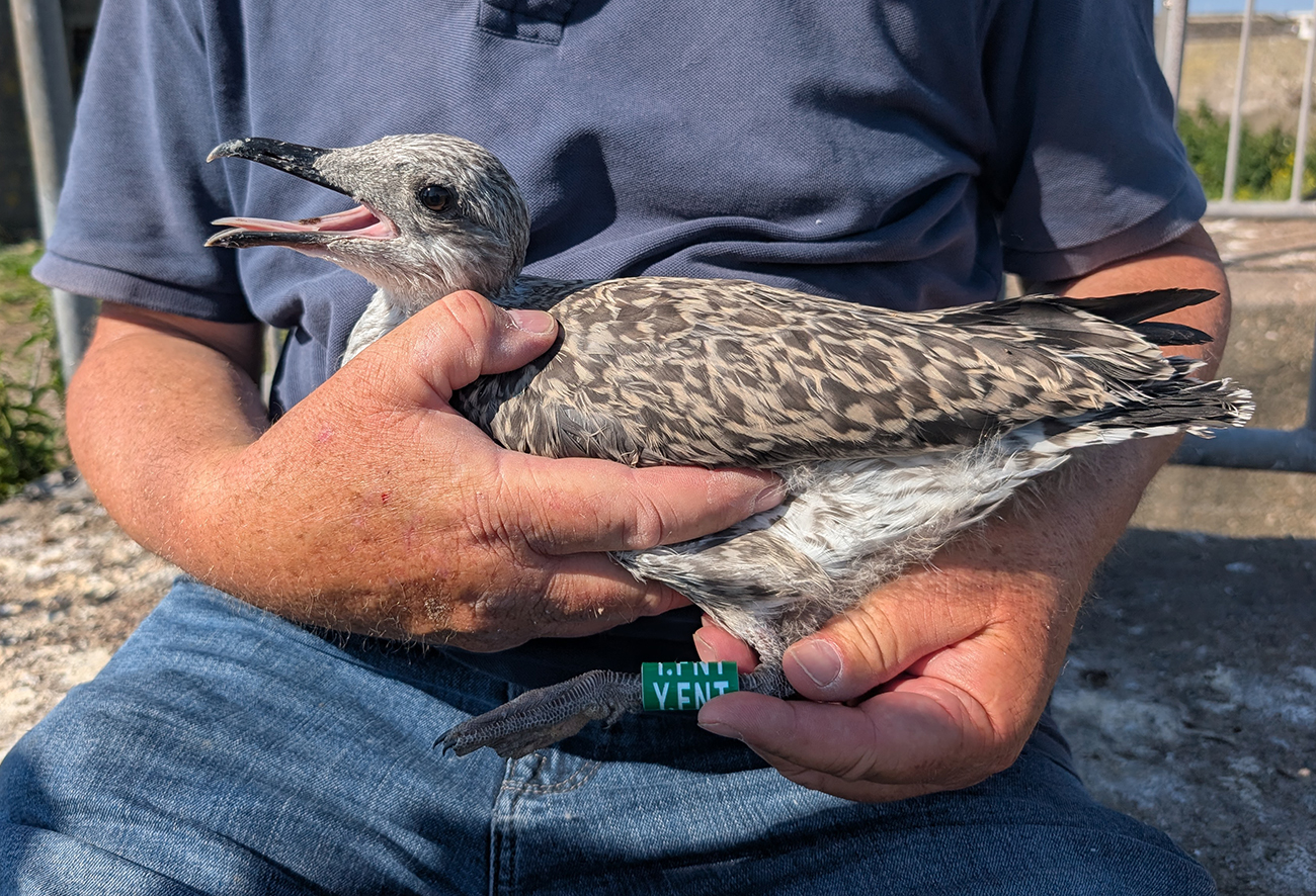 below: Lesser Black-backed Gull (graellsii) Y.FNT 1CY, July 01 2025, IJmuiden, the Netherlands. Picture: IJmuiden Ringing Team.