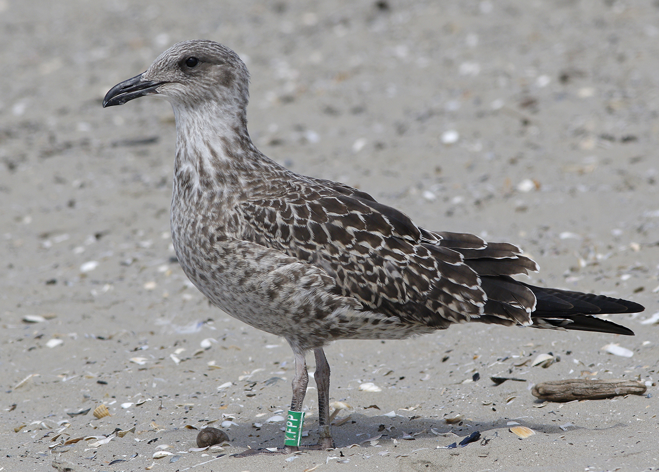 below: Lesser Black-backed Gull (graellsii) Y.FPP 1CY, July 29 2025, IJmuiden, the Netherlands. Picture: Mars Muusse.