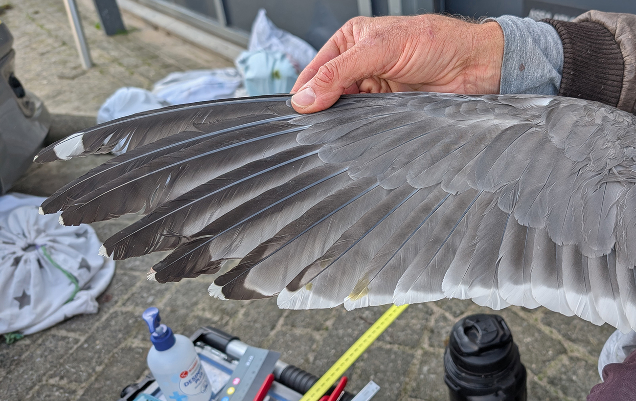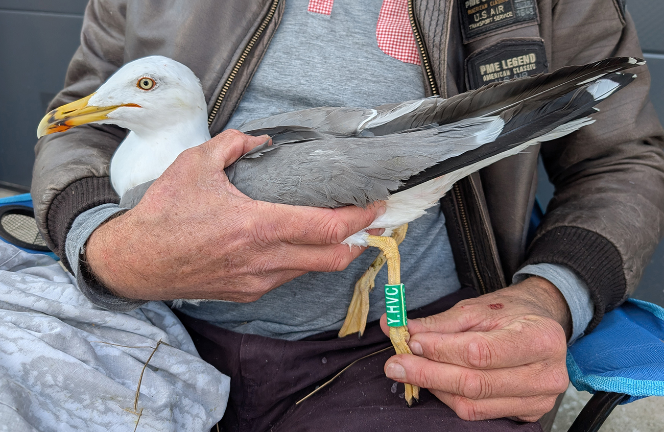 Lesser Black-backed Gull (graellsii) Y.HVC adult, March 15 2026, Katwijk, the Netherlands. Picture: Thijs Horst & Mars Muusse.HPAIV-H5N1 monitoring for Vogeltrekstation Arnhem. Trapped near rooftop breeding colony at industrial estate "t Heen - Katwijk". below: Lesser Black-backed Gull (graellsii) Y.HVC >4CY, March 15 2026, Katwijk, the Netherlands. Picture: Thijs Horst & Mars Muusse.