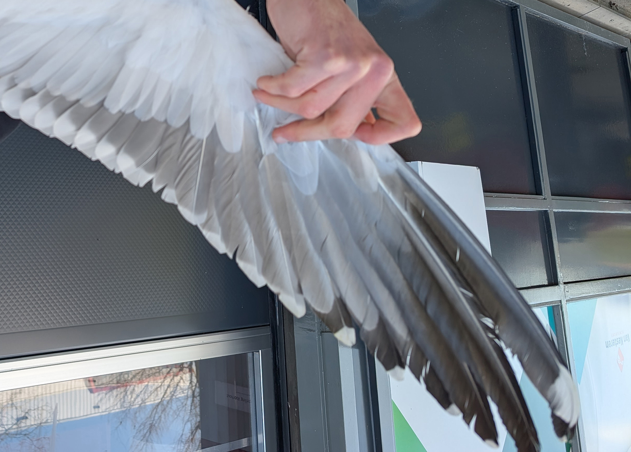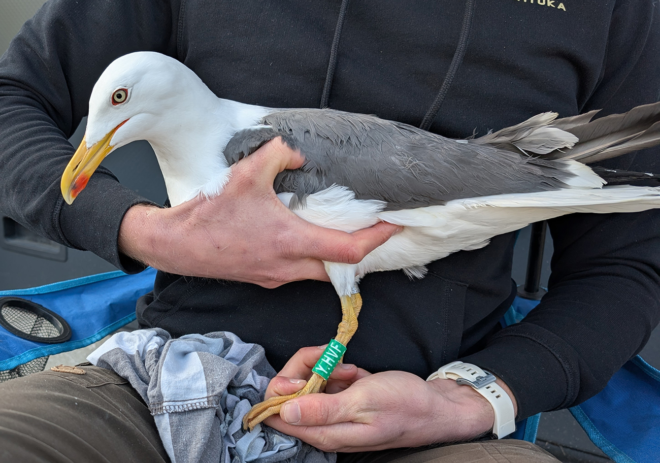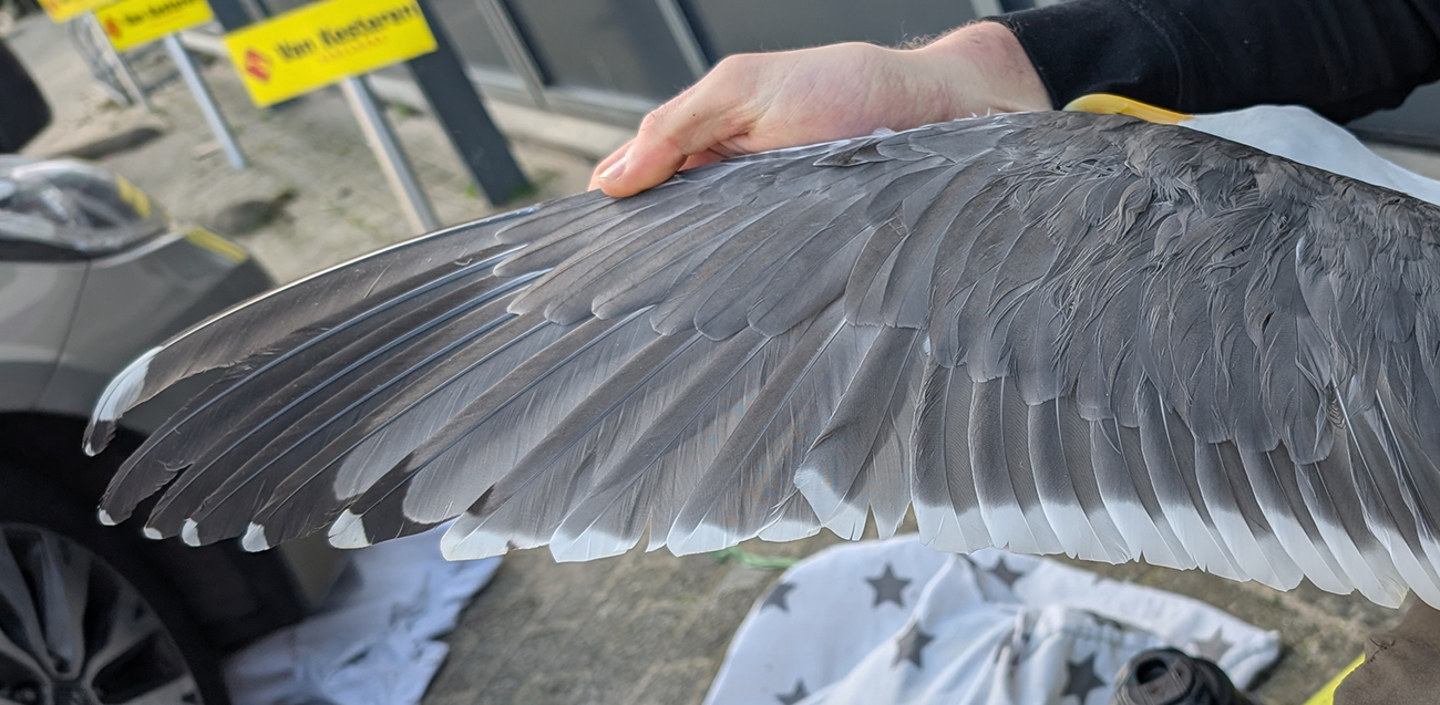 Lesser Black-backed Gull (graellsii) Y.HVF adult, March 15 2026, Katwijk, the Netherlands. Picture: Thijs Horst & Mars Muusse.HPAIV-H5N1 monitoring for Vogeltrekstation Arnhem. Trapped near rooftop breeding colony at industrial estate "t Heen - Katwijk". below: Lesser Black-backed Gull (graellsii) Y.HVF >4CY, March 15 2026, Katwijk, the Netherlands. Picture: Thijs Horst & Mars Muusse.