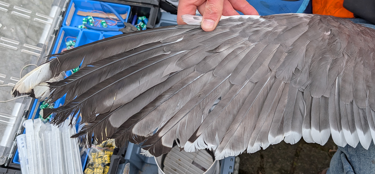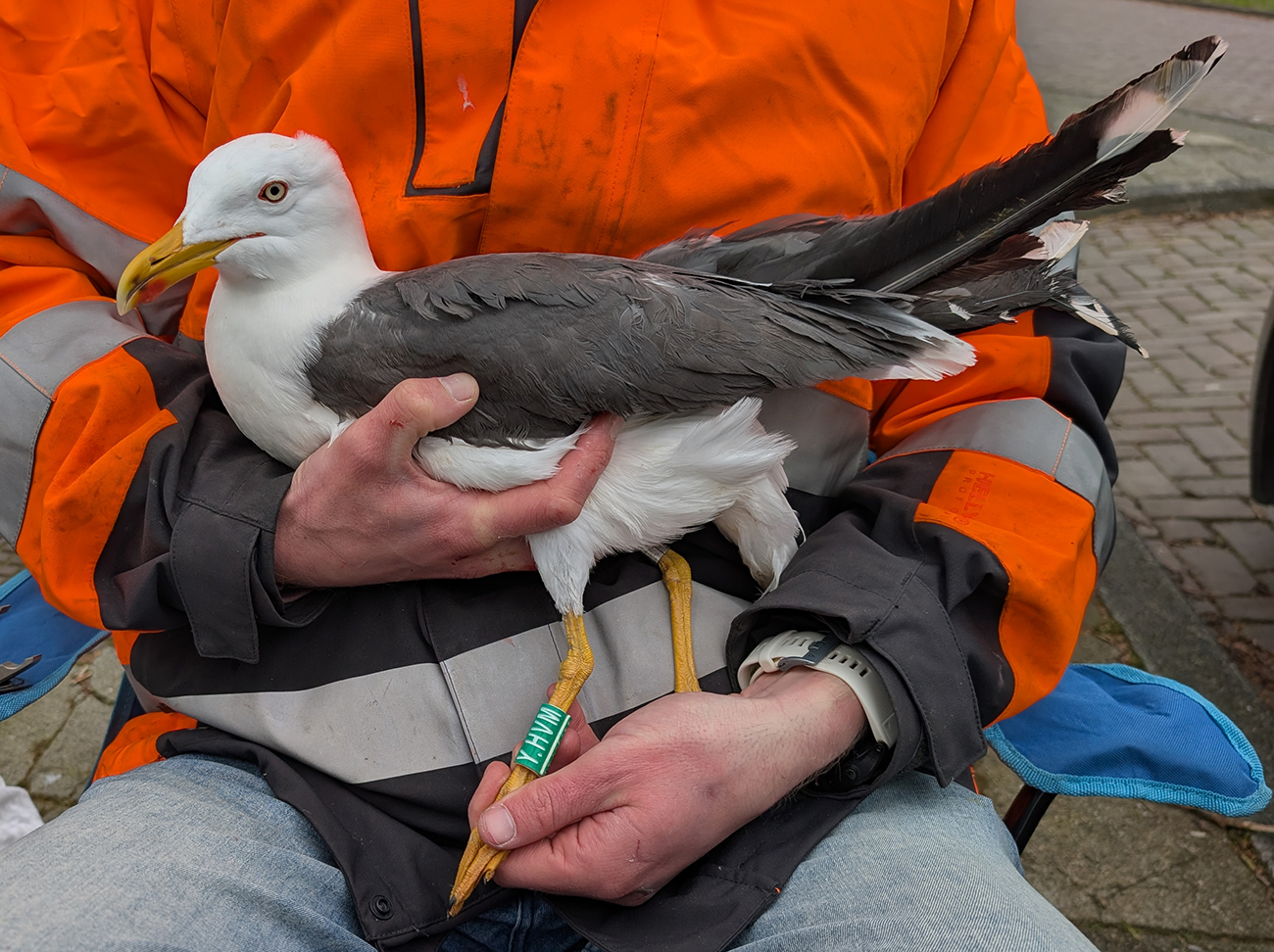 Lesser Black-backed Gull (graellsii) Y.HVM adult, March 29 2026, Leiden, the Netherlands. Picture: Thijs Horst & Mars Muusse.HPAIV-H5N1 monitoring for Vogeltrekstation Arnhem. Trapped near rooftop breeding colony at flats and apartments in the city of Leiden. below: Lesser Black-backed Gull (graellsii) Y.HVM >4CY, March 29 2026, Leiden, the Netherlands. Picture: Thijs Horst & Mars Muusse.