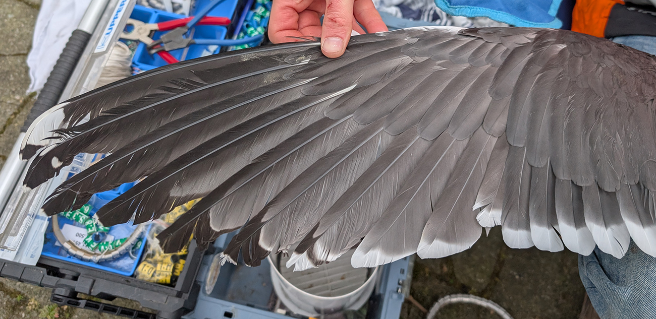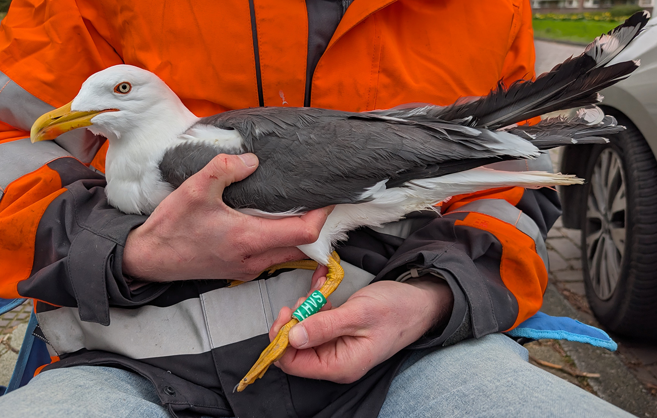 Lesser Black-backed Gull (graellsii) Y.HVS adult, March 29 2026, Leiden, the Netherlands. Picture: Thijs Horst & Mars Muusse.HPAIV-H5N1 monitoring for Vogeltrekstation Arnhem. Trapped near rooftop breeding colony at flats and apartments in the city of Leiden. below: Lesser Black-backed Gull (graellsii) Y.HVS >4CY, March 29 2026, Leiden, the Netherlands. Picture: Thijs Horst & Mars Muusse.