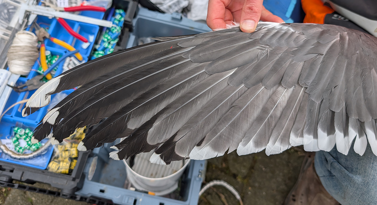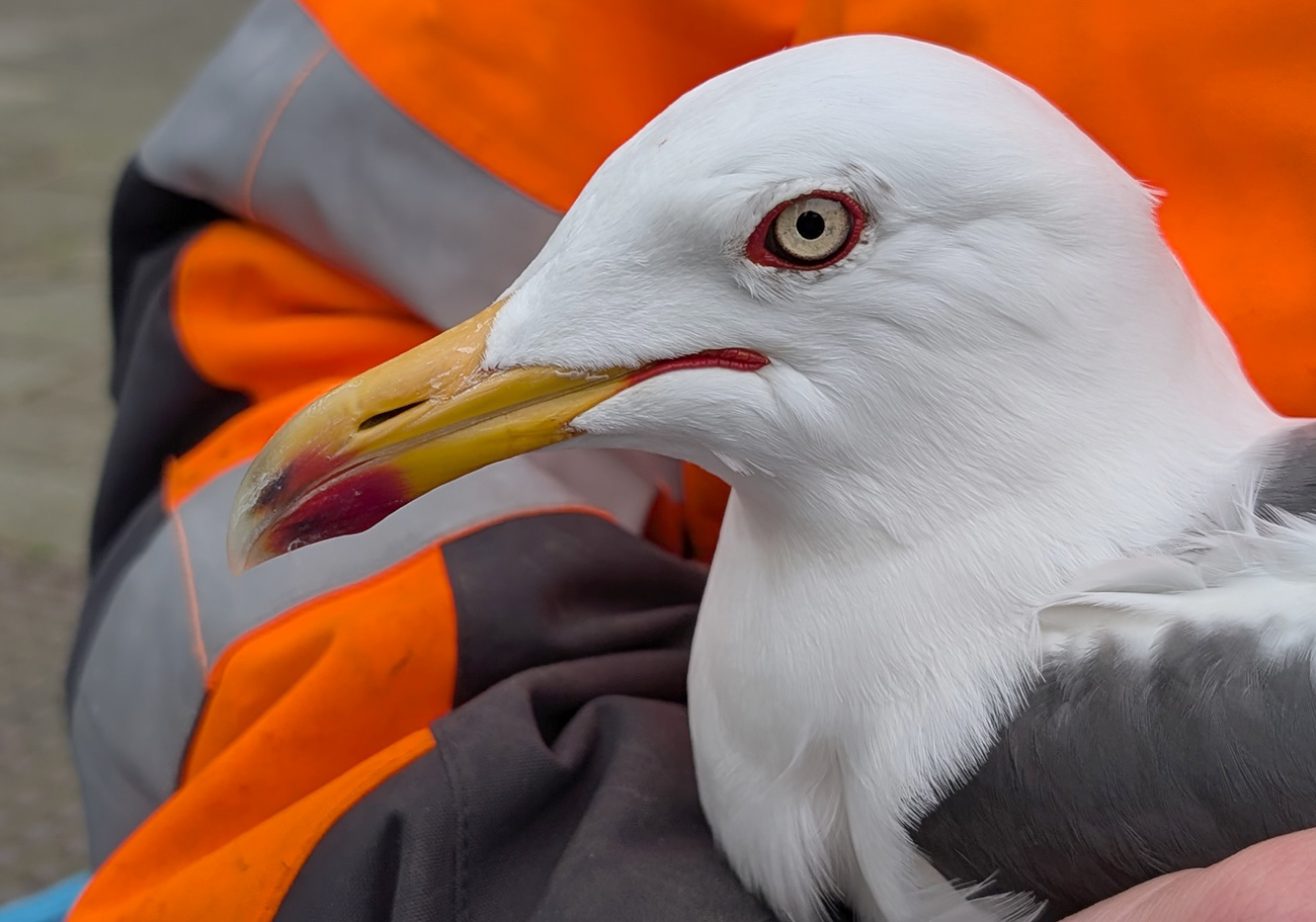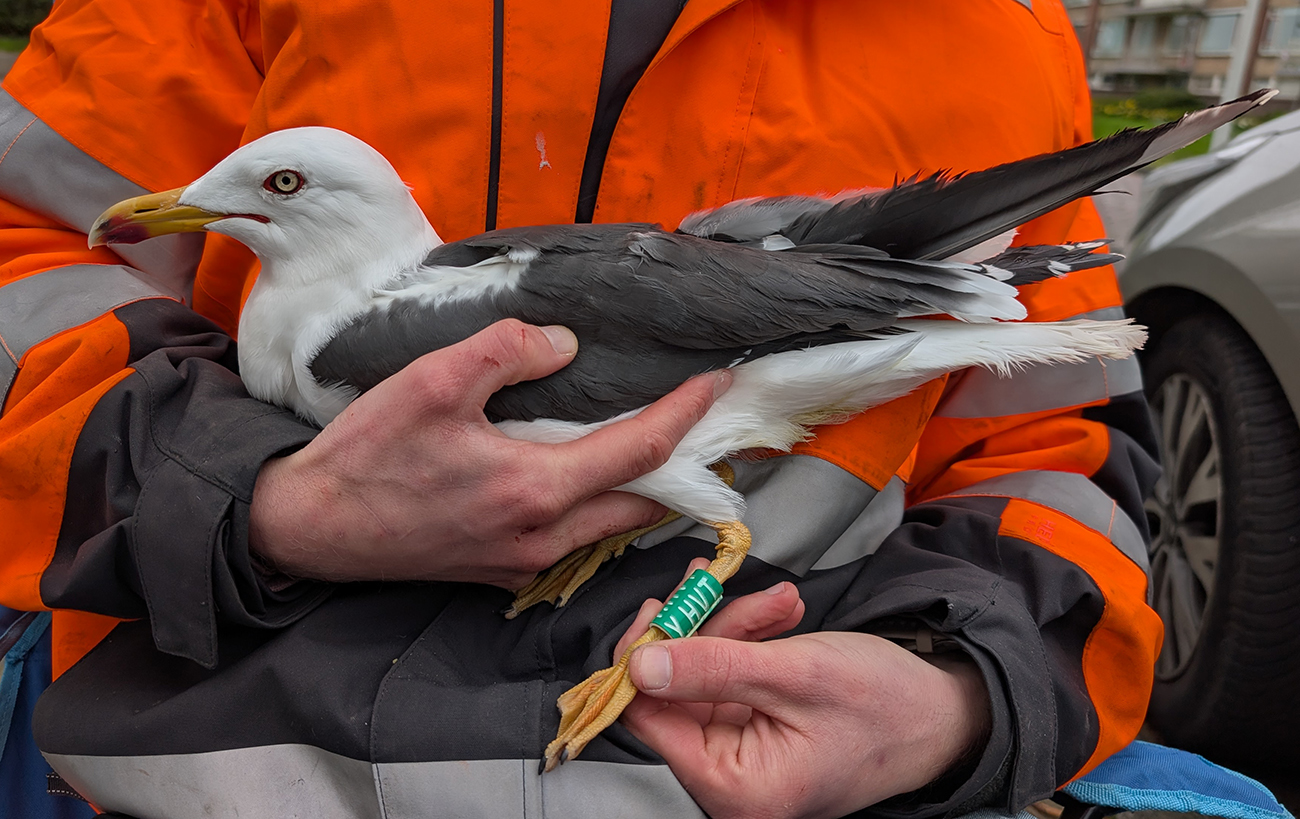 Lesser Black-backed Gull (graellsii) Y.HVT adult, March 29 2026, Leiden, the Netherlands. Picture: Thijs Horst & Mars Muusse.HPAIV-H5N1 monitoring for Vogeltrekstation Arnhem. Trapped near rooftop breeding colony at flats and apartments in the city of Leiden. below: Lesser Black-backed Gull (graellsii) Y.HVT >4CY, March 29 2026, Leiden, the Netherlands. Picture: Thijs Horst & Mars Muusse.