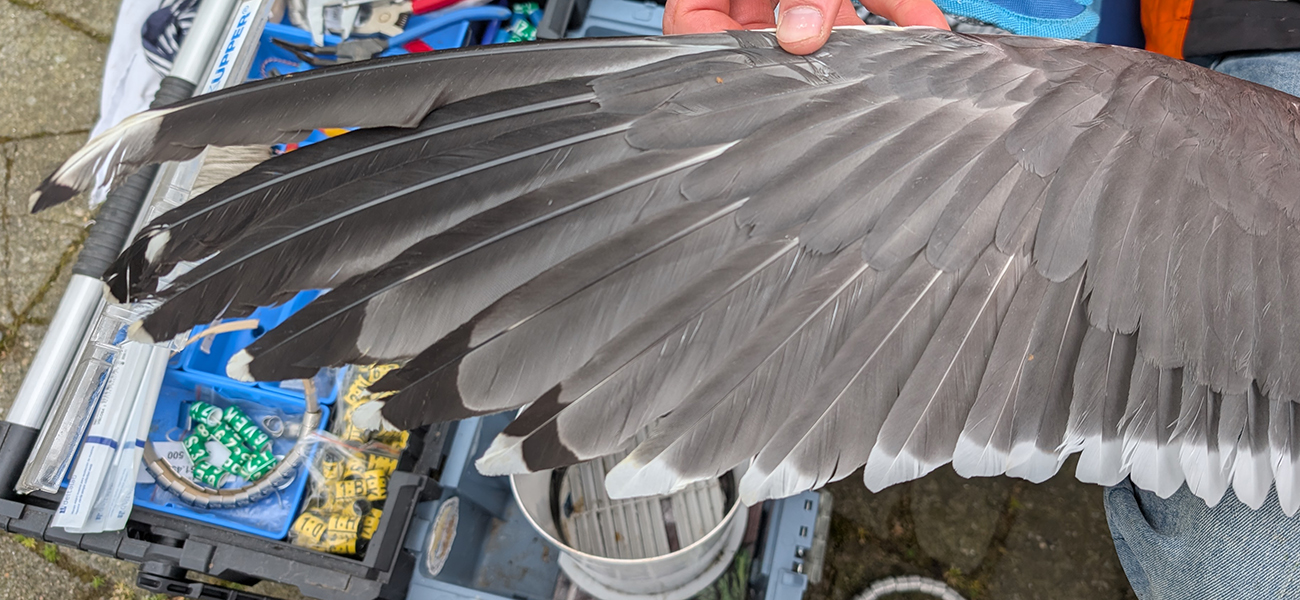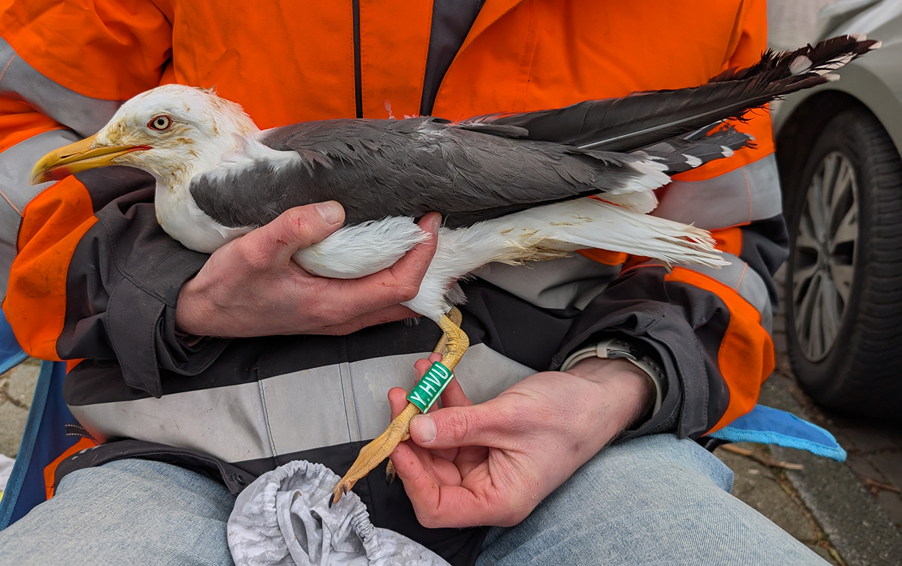 Lesser Black-backed Gull (graellsii) Y.HVU adult, March 29 2026, Leiden, the Netherlands. Picture: Thijs Horst & Mars Muusse.HPAIV-H5N1 monitoring for Vogeltrekstation Arnhem. Trapped near rooftop breeding colony at flats and apartments in the city of Leiden. below: Lesser Black-backed Gull (graellsii) Y.HVU >4CY, March 29 2026, Leiden, the Netherlands. Picture: Thijs Horst & Mars Muusse.