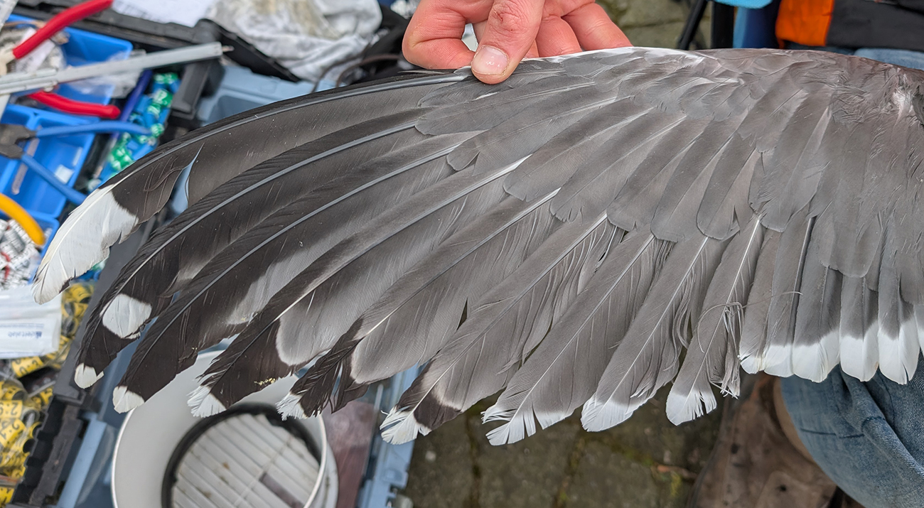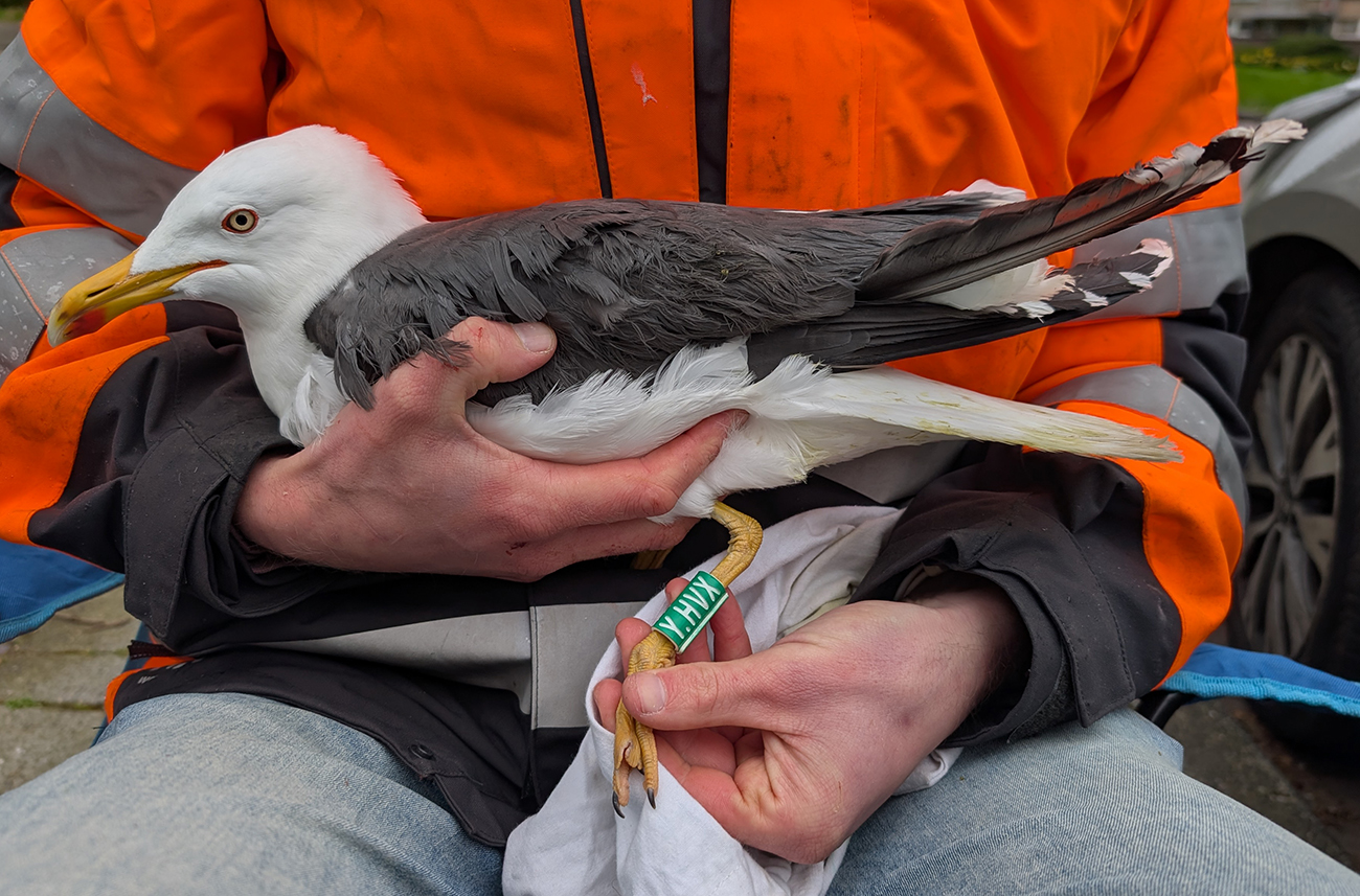 Lesser Black-backed Gull (graellsii) Y.HVX adult, March 29 2026, Leiden, the Netherlands. Picture: Thijs Horst & Mars Muusse.HPAIV-H5N1 monitoring for Vogeltrekstation Arnhem. Trapped near rooftop breeding colony at flats and apartments in the city of Leiden. below: Lesser Black-backed Gull (graellsii) Y.HVX >4CY, March 29 2026, Leiden, the Netherlands. Picture: Thijs Horst & Mars Muusse.