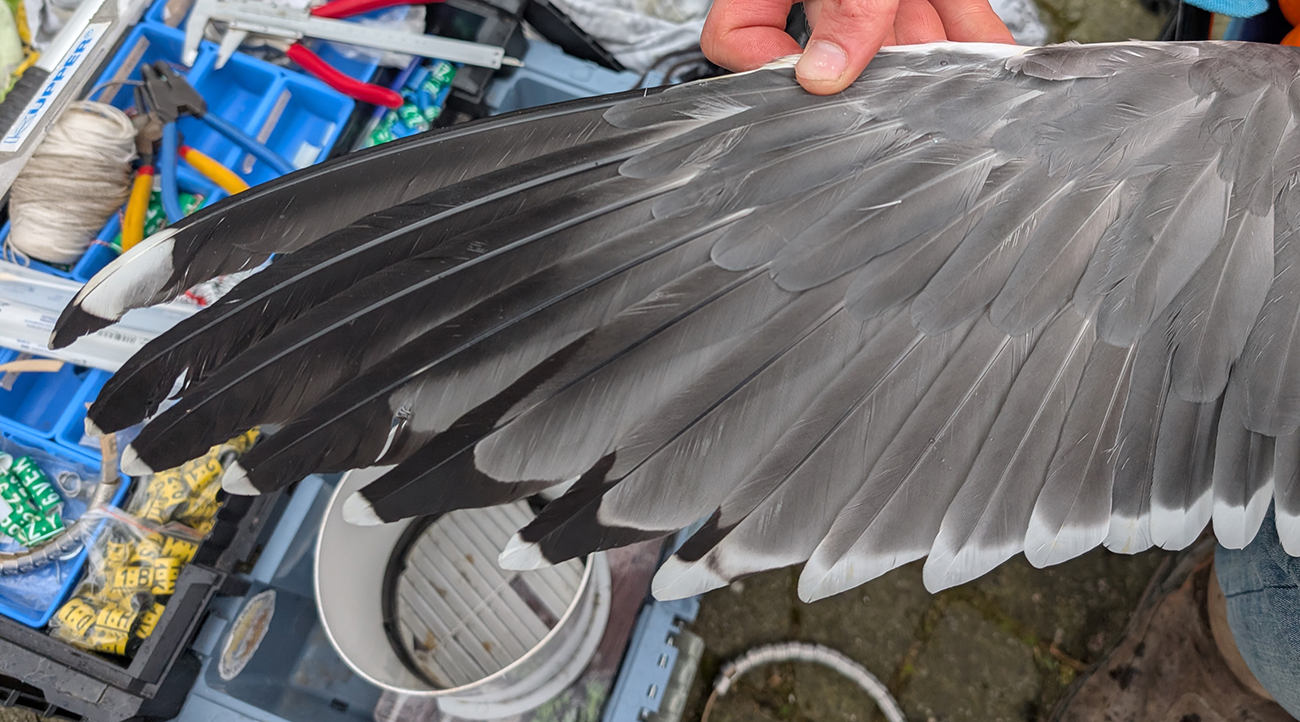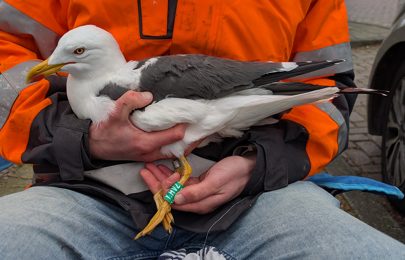Lesser Black-backed Gull (graellsii) Y.HVZ adult, March 29 2026, Leiden, the Netherlands. Picture: Thijs Horst & Mars Muusse.HPAIV-H5N1 monitoring for Vogeltrekstation Arnhem. Trapped near rooftop breeding colony at flats and apartments in the city of Leiden. below: Lesser Black-backed Gull (graellsii) Y.HVZ >4CY, March 29 2026, Leiden, the Netherlands. Picture: Thijs Horst & Mars Muusse.