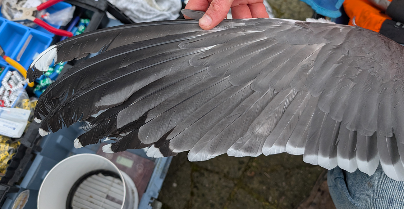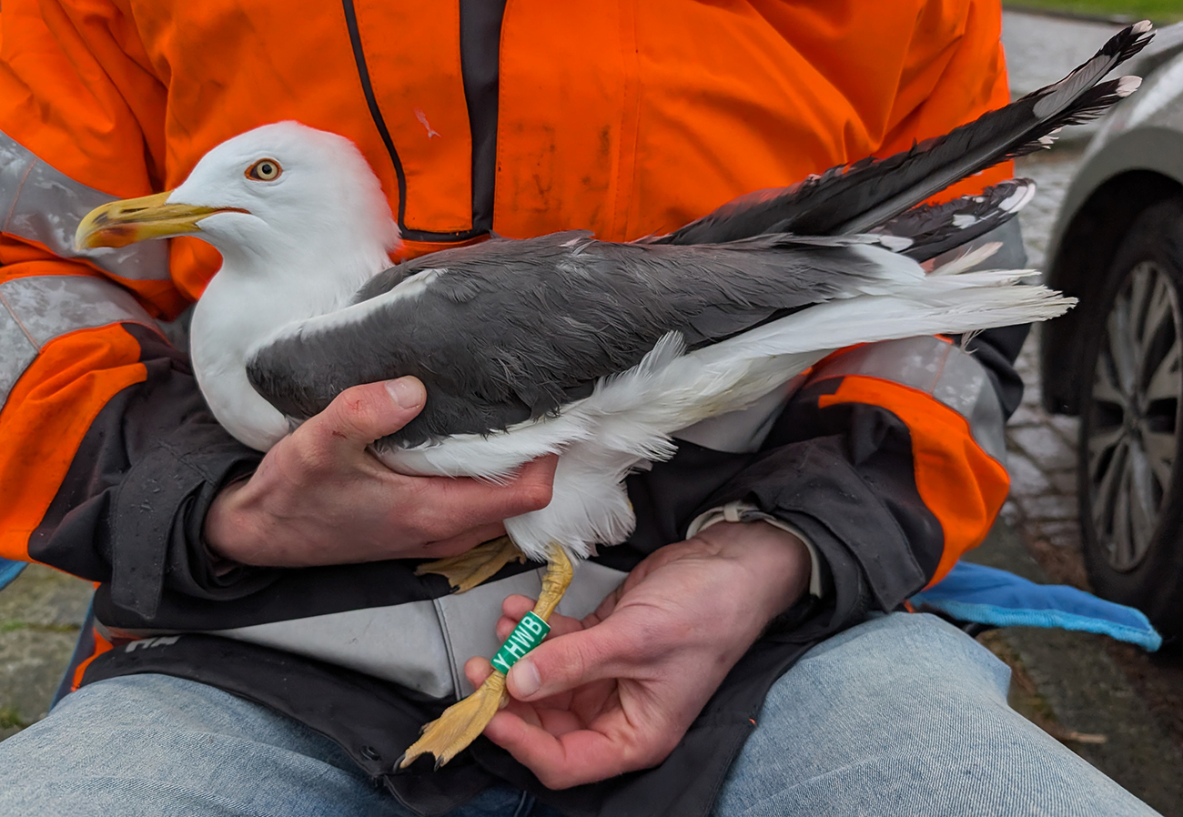Lesser Black-backed Gull (graellsii) Y.HWB adult, March 29 2026, Leiden, the Netherlands. Picture: Thijs Horst & Mars Muusse.HPAIV-H5N1 monitoring for Vogeltrekstation Arnhem. Trapped near rooftop breeding colony at flats and apartments in the city of Leiden. below: Lesser Black-backed Gull (graellsii) Y.HWB >4CY, March 29 2026, Leiden, the Netherlands. Picture: Thijs Horst & Mars Muusse.
