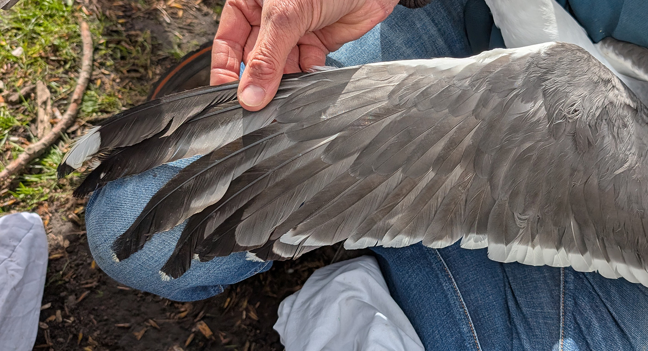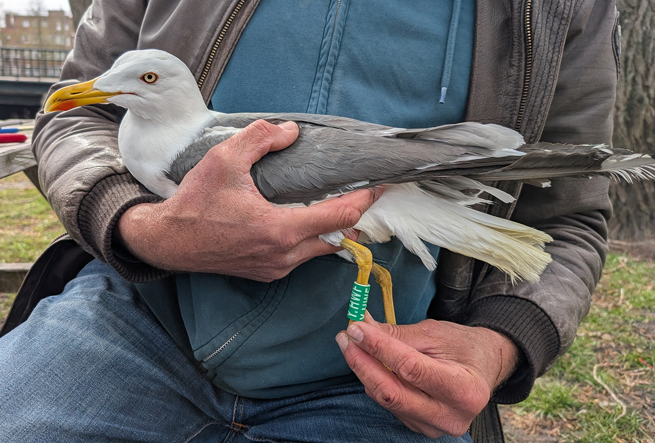 Lesser Black-backed Gull (graellsii) Y.HWF adult, March 30 2026, Amsterdam, the Netherlands. Picture: Thijs Horst & Mars Muusse.HPAIV-H5N1 monitoring for Vogeltrekstation Arnhem. Trapped in the city of Amsterdam, junction Hoofdweg - Erasmusgracht. below: Lesser Black-backed Gull (graellsii) Y.HWF >4CY, March 30 2026, Amsterdam, the Netherlands. Picture: Thijs Horst & Mars Muusse.
