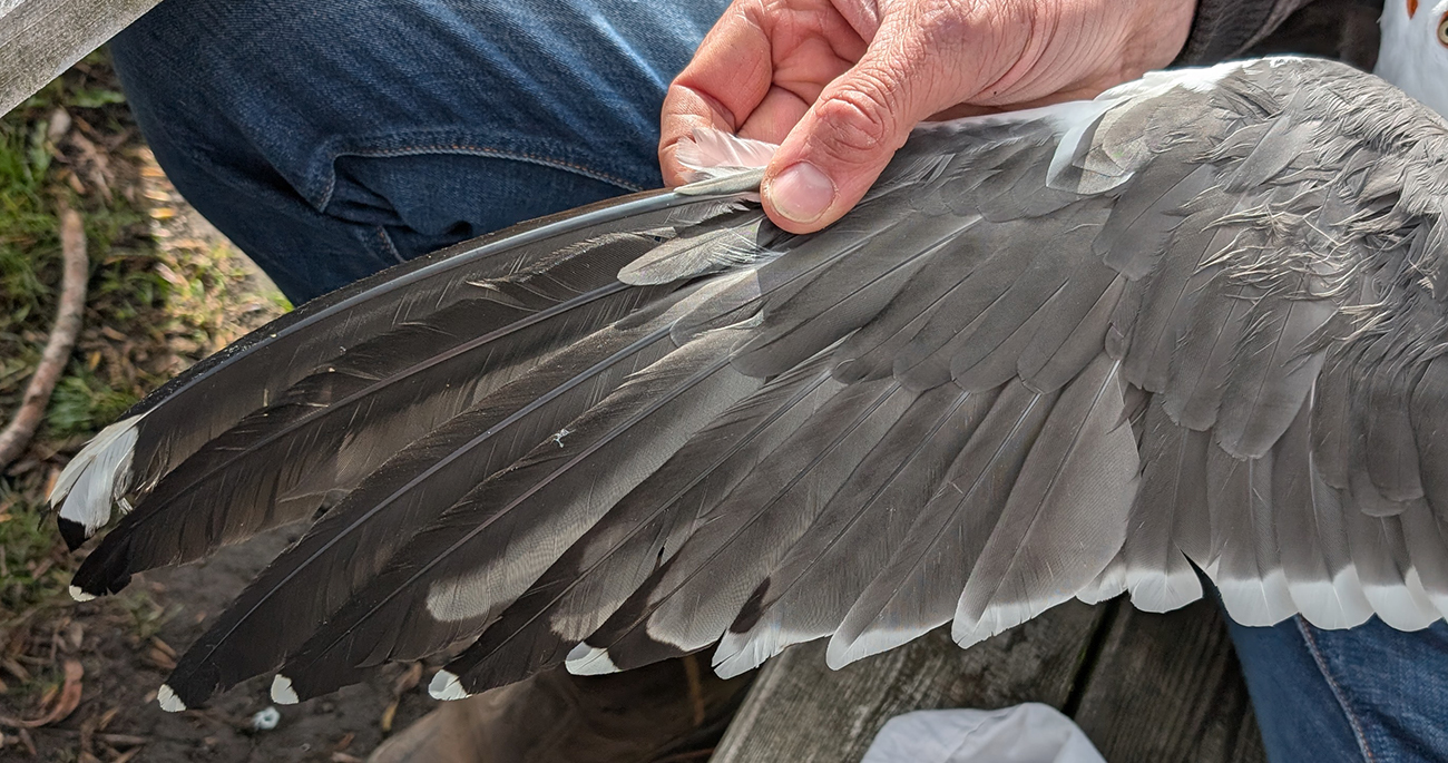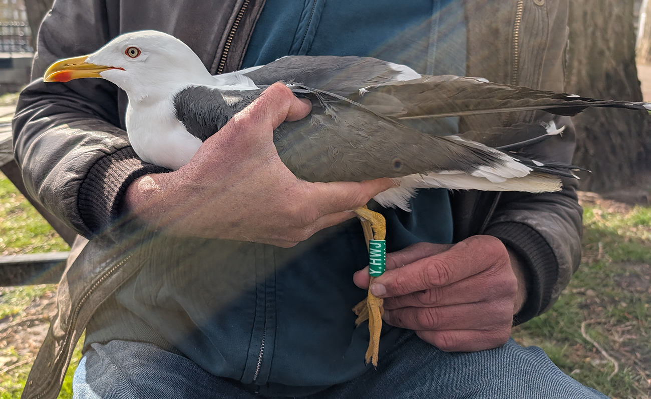 Lesser Black-backed Gull (graellsii) Y.HWJ adult, March 30 2026, Amsterdam, the Netherlands. Picture: Thijs Horst & Mars Muusse.HPAIV-H5N1 monitoring for Vogeltrekstation Arnhem. Trapped in the city of Amsterdam, junction Hoofdweg - Erasmusgracht. below: Lesser Black-backed Gull (graellsii) Y.HWJ >4CY, March 30 2026, Amsterdam, the Netherlands. Picture: Thijs Horst & Mars Muusse.