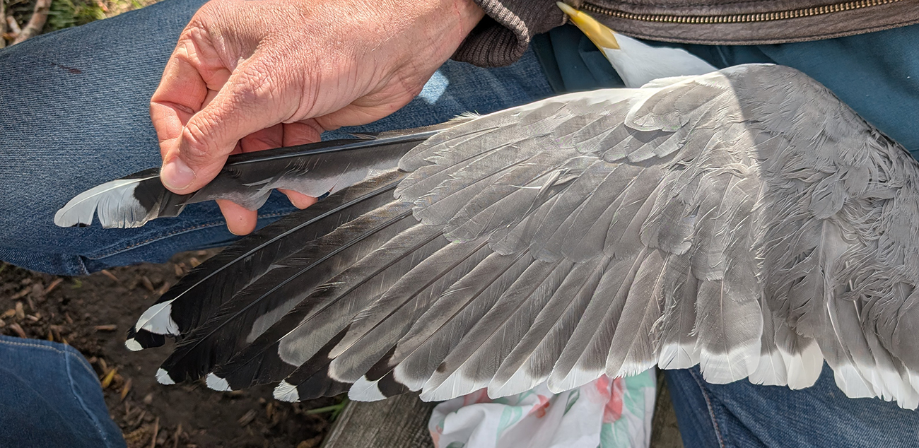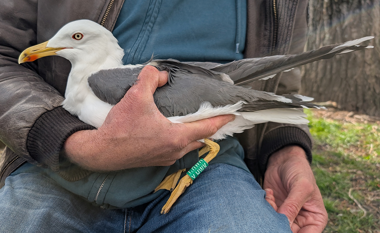 Lesser Black-backed Gull (graellsii) Y.HWK adult, March 30 2026, Amsterdam, the Netherlands. Picture: Thijs Horst & Mars Muusse.HPAIV-H5N1 monitoring for Vogeltrekstation Arnhem. Trapped in the city of Amsterdam, junction Hoofdweg - Erasmusgracht. below: Lesser Black-backed Gull (graellsii) Y.HWK >4CY, March 30 2026, Amsterdam, the Netherlands. Picture: Thijs Horst & Mars Muusse.