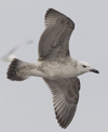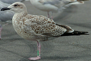 1CY Herring Gull ( argentatus) KY14 October 19 2007, Hoek van Holland, the Netherlands. Picture: Evert Eijkelenboom. From White Sea, N Russia (67°05 N). Partial score is 28 (no scoring on primary projection & no scoring on scapulars, bird completely juvenile by mid-October). |