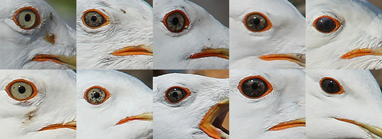 3cy cachinnans: March Phenotypic variation and systematics of Mongolian GullIN: Dutch Birding 23: 82, 2001 BY: Pierre Yésou PART 1: INTRO & DISTRIBUTION BELOW PART 3: BILL, EYE & LEG COLOUR Bill colourThe bill is yellow, varying from pale yellow to bright orange-yellow, commonly with a paler tip. The red gonydeal spot usually does not reach the upper edge of the lower mandible, falling short by 2-3 mm. Dark markings (spots or broken lines in front of the red gonydeal spot) occur in one out of three birds. Of 107 adult-plumaged birds trapped at nests and examined in the hand, 17% showed dark markings on the upper mandible only and 15% on both mandibles (in one extreme case, the markings formed an almost complete dark bill band of c 3 mm width). Eye colourThe orbital ring was vermilion-red in all adult-plumaged birds I examined in the hand. Pyzhianov & Tupitchyn (1992) described the iris as ranging from pale ashy-grey to olive-grey to dark smoky-grey. 54 and 68% of their samples of Lake Baikal and Lake Khubsugul, respectively, were pale eyed. They found no correlation be tween iris and leg colours (a point I did not check). ![]() FIGURE 2 Variability of iris pigmentation Mongolian Gull Larus (cachinnans) mongolicus at Lake Baikal, Siberia, Russia (redrawn from field sketches of birds in hand) (Pierre Yésou). Source Surfbirds: IDENTIFICATION OF ADULT VEGA GULL: FIELD OBSERVATIONS FROM JAPAN, FEBRUARY 2003 by Chris Gibbins. In the birds l examined in the hand, the iris was dull yellow (very pale, almost whitish, in some), usually peppered with grey (pale bluish-grey to dark grey-brown) minute spots in variable density over a much variable extent of the iris surface. In some birds, the grey was peppered quite uniformly over the iris, often with a few small aggregations forming dark marks on the overall pale eye. In other cases, dense grey spots formed one or more large dark areas over the eye while sparse spotting left the yellow iris colour showing over the rest of it (figure 2). Eye darkness is not sex related. Pale eyes and dark eyes are found in both males and females and pairing occurs irrespective of the iris colour (of eight pairs, the male had darker eyes than the female in four cases and the female had darker eyes than the male in three cases; the partners of the remaining pair showed similarly coloured eyes). Such a high variability of iris pigmentation makes it difficult to accurately comment on the eye colour of mongolicus. In a first analysis of 43 birds in the hand, l classified 28% of them as pale eyed, 42% as intermediate and 30% as dark eyed. A more detailed analysis, including two more samples (table 3), showed that nearly one-third was pale eyed while grey spots covered more than half of the iris surface in another third. Really dark-eyed birds, however, accounted for less than 10%. In the field, colour assessment is less easy. Of 236 adult birds studied through binoculars or telescope, 89% were classified as yellow or yellowish eyed. It thus seems that eyes classified as pale grey in the hand are perceived as yellowish in the field while dark-eyed birds accounted for only 4% in the field sample (not statistically different from the 8% found during the in-hand examination).