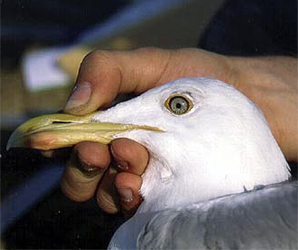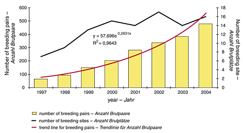 Neubauer, G., M. Zagalska-Neuhauer, R. Gwiazda, M. Faber, D. Bukaciriski, J. Betleja & R Chylarecki PART 1: INTRODUCTION & METHODS 3. Results3.1. Distribution and numbersLarge gulls in Poland show a clear distribution pattern (Fig. 1), Herring Gull breeds mainly at the coast, with fewer inland localities confined to lower reaches of Vistula River and lakes in the northern part of the country. Caspian Gull is confined to southern and eastern part of the country, where it breeds on various artificial reservoirs (gravel pits, sedimentation basins, fish ponds and dam reservoirs) and along the middle and upper Vistula. Both species meet in central Poland, where they breed in mixed colonies and form mixed pairs. Yellow-legged Gull has only a marginal influence on Polish population of large gulls, as it remains very rare and local. Herring Gull Larus argentatus Since the first breeding record in late 1960s, numbers of argentatus have increased continuously, reaching a maximum of some l,900-2,100 pairs breeding at over 50 localities in 1987-1992. The population as a whole increased exponentially by about 13% per year in the 1970s and by 20% per year in the 1980s, with largest colonies showing annual growth rates between 20% and 60%. Since the early 1990s, the population decreased to more than 1,600 breeding pairs around 1996 (the total of 2,100-2,200 breeding pairs in 1994-96 given in TOMIALOJC & STAWARCZYK 2003 can be an overestimate, produced by summing up maximal numbers from a period of several years), and some 1,200-1,500 pairs in 2003-2004 (surveys by J. ANTCZAK, S. BZOMA & G. KILJAN). The largest colony situated at the Bielawki Islands, Szczecin Lagoon accounted to 900-1,000 pairs in 1991, c. 980 pairs in 1996, but only c. 70 pairs bred there in 2000 with single pairs left in 2002-03. At the same time, smaller colonies have been established on the roof-tops nearby, but they consisted of much less pairs (G. KILIAN, pers. comm.). Two more large argentatus colonies peaked in the 1980s and 1990s and are left nowadays: Vistula mouth near Gdansk (up to 210 pairs 1994-95) and Gardno lake in Slowinski National Park, middle coast (up to 320 pairs in 1985, BEDNORZ 1983; GORSKI et al. 1990). At present, most of the Herring Gull population breeds on roof-tops in towns along the Baltic coast, where birds have moved from natural habitats. The largest roof-top colonies are situated close to the earlier mentioned natural breeding sites; in Ustka (450 pairs in 1996, ZICLKOWSKI 1994; TOMIALOJC & STAWARSZYK, 2003, but only c. 150 in 2004, J. ANTCZAK, pers. comm.) and Gdansk-Gdynia-Sopot agglomeration area (estimated at c. 300 pairs in 2003-04, BZOMA 2001 and S. BZOMA, pers. comm). Inland breeding sites (comprising up to 15 breeding pairs in most cases) are scattered in the northern part of the country (Fig. 1), at lakes and on river islands or in artificial reservoirs. The largest inland colony (which includes up to 30% of Caspian Gulls and hybrids) is located at Wloclawek Reservoir, lower Vistula (see below, Photo 1) and comprised 135-143 breeding pairs in 2002-04. Single individuals and pairs were detected during 1995-2004 at the middle Vistula between Deblin and Kozienice power station with Zastow Karczmiski being the southernmost locality currently known. Caspian Gull Larus cachinnans The first few breeding pairs were recorded in 1981-82 at the middle Vistula. Originally, they were reported as Herring Gulls sensu lato (WESOLOWSKI et al. 1984), but subsequently were identified as cachinnans (BUKACINSKI et al. 1989; DUBOIS et a., 1990), although identity of these birds remained controversial (EIGENHUIS 1990; CHYLARECKI & SIKORA 1991; DUBOIS & STAWARCZYK 1991; EIGENHUIS 1991). Middle Vistula was the only place, where the putative Caspian Gull bred regularly until 1992, when the colony of unequivocal cachinnans in Tamow was established (MARTYKA & SKORKA 1999; MARTYKA et al. 2002). A real information boom started in the late 1990s and coincided with a rapid increase in numbers. Breeding sites are now grouped mainly in the southern and eastern part of Poland and especially along middle and upper Vistula; these accounted together for c. 90% of the breeding population in 2004. The largest colonies in 2004 were the island near Zastéw Karczmiski on the middle Vistula with c. 240 pairs (estimated to hold at least 90% of Caspian Gull, R SZEWCZYK et al., pers. comm.; POVTAKIEWICZ et al. in prep.; own data), Jankowice with c. 120 pairs and Mietkow Reservoir with c. 40 pairs. The northernmost breeding site was Wloclawek Reservoir, Lower Vistula. Between 1990 and 2004, Caspian Gulls bred in at least 31 sites (Fig. 1 and Fig. 2), rapidly increasing in numbers to reach a total of 480 breeding pairs in 2004. Between 1997 and 2004, the Polish population of Caspian Gulls showed an exponential growth, with an annual rate of increase of 33% (Fig. 2).