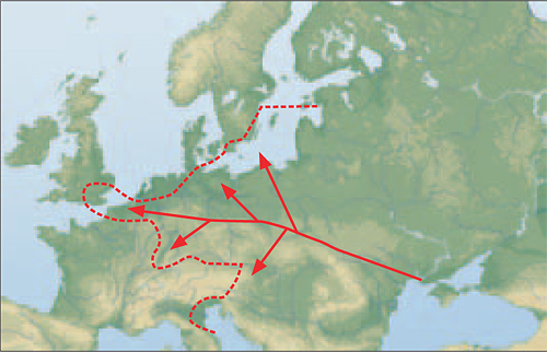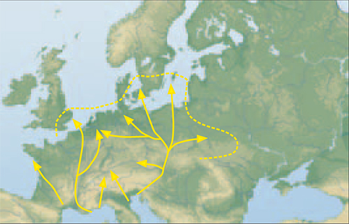 This results in the overall picture (Fig. 4) that Caspian Gulls from the Black Sea migrate westwards to Central Europe roughly along the northern edge of the Carpathian Mountains. A large proportion of birds then pass through Sachsen to the Ruhr area and some birds even further into northern France and southern England. Other birds follow a more northwest route and reach the great river valleys (Vistula, Oder) and end in the southwestern Baltic Sea. At the moment it is just speculation how much of the population from the Black Sea follow this westwards journey, but since there are at least a few thousand birds involved performing this trip in late summer, it is certainly significant on population level. Moreover, Caspian Gull from Ukraine (Dnjepr reservoir at Kanev) only receive a metal ring (so, no easy readable colour ring) and still three to five ring codes have been recorded from almost every ring series (= 100 rings) in the research area for this publication. Metal ringed Herring Gulls from the Baltic do not show higher recovery rates for distant areas (> 100 km) (Klein 2001)! In this context it is remarkable how many ring readings were made on Caspian Gulls ringed as pullus in Odessa (approximately 1,200 birds ringed 1994-2003, T. Ardamatzkaja pers. comm.); this resulted in quite a lot of recoveries from Central Europe, but only one from Israel, although observation intensity is comparable. On the opposite, of 130 ringed juvenile Caspian Gulls in 1998 at Volga Delta (Caspian Sea), none was recorded from the West, but eleven different individuals were read in Israel (Lieber 2000; N.v. Swelm pers. comm.). There are no ring data available to show the retreat of Caspian Gulls to the east. The increase in recovery rates in higher winter, especially in Poland, can be explained as well as an escape of bitterly cold weather in Eastern Europe. The significant decline in winter ring readings especially from inland Western Germany (Fig. 3) could be an indication of a movement back towards the east, assumed these birds do not continue their journey to Western Europe. Caspian Gull has extended its breeding area to the west in recent years and now it nests regularly in southern Poland and Lausitz. Hence, the growing number of ring readings in Western and Central Europe can not solely be explained by improved optical technology. The influxes of Yellow-legged Gull to Western Europe in summer are well documented for some time (Bulteel 1983, de Mesel 1990). Only in the 1990s (Bengtsson 1994, Klein 1994) it became clear they also reach the Baltic Sea. Nowadays it is also known that Italian birds can reach into the Western Ukraine (K. Kravos pers. comm.). On the northern Black Sea, which actually is the breeding area for Caspian Gull, Yellow-legged Gull is often widespread in summer, including Greek ring birds that were seen here (P. Bzoma pers. comm.). One may therefore assume that the situation here is quite similar and these birds originate from the Aegean Sea and from the north coast of Anatolia. For the latter area there are no detailed studies about breeding gulls, but they “breed on rocks” and descriptions of observers (I. Weiss pers. comm.) suggest only Yellow-legged Gull is involved. When comparing the phenology, it is striking that the peak occurrence, not only for Caspian Gull but also in Yellow-legged Gull in Poland is earlier in the season than in northern Germany. This suggests that the majority of Yellow-legged Gulls do not arrive from the south, but from the southeast, avoiding the eastern Alps to use the Danube Plain and Moravian Gate to reach Central Europe (Fig. 5). This scenario is supported by ring readings: all ringed birds of this species read in Poland came from the northern Adriatic Sea. However, in West Germany ringed gulls also arrived regularly from the Camargue and Tuscany (A. Buchheim, pers. comm.).