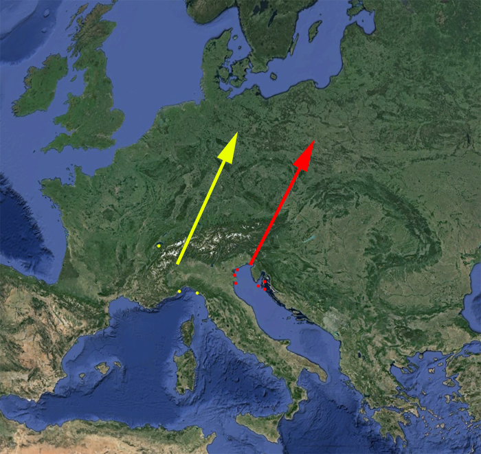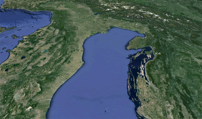 Below: Looking northwards into the Northern Adriatic Sea, with left N Italy and the balkan on the right. The Croatian coast holds many many islands and inlets, origin for Yellow-legged Gull michahellis turning up in Poland. One of the larger Croatian islands is Krk with small adjacent islands where many birds are ringed darvic red or yellow starting with S.