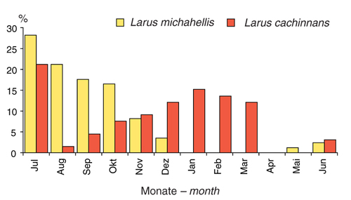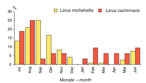 In Poland the occurrence of Caspian and Yellow-legged Gulls peak in July (Fig. 1). For Yellow-legged Gulls, July is the peak and the number of recorded ringed gull continuously decreases towards the winter when they almost completely disappear from the region. Caspian Gulls have two peaks: one in July and another in the winter months. In May/June when adults are breeding, immature birds start to appear again. Numerous ring readings evidently support that the same places are often visited year after year. The distribution pattern of gulls on the German Baltic coast is more or less similar (Fig. 2). The summer peak is only slightly shifted and Caspian Gulls are found more often than in the early 1990s (cf. Klein 1994).