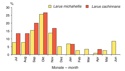 Fig. 1: Seasonal distribution of ring identifications of Caspian and Yellow-legged Gulls in Northern
