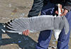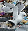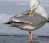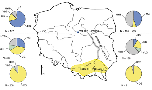 3.2.2. Population structure and mixed pairing within the north-south gradientAt Wloclawek Reservoir (‘northern zone), the population structure (based on 177 trapped birds in 2002-04) shows strong dominance of Herring Gull (126 individuals, 71%), followed by Caspian Gull (27 individuals, 15%) and hybrids (19 individuals, 11%), a single Yellow-legged Gull female and four unidentified birds (Fig. 3). Most of 19 birds classified as hybrids (16 individuals) showed characters intermediate between Herring Gull and Caspian Gull (Photo 3-4), and we suppose they were F1 hybrids. Six of them were ringed as chicks in Wloclawek colony during 1992-99 (1992: 1, 1993: 1, 1994: 2, 1999: 2), except for one bird that originated from the middle Vistula (ringed 1995 as a chick near Tyrzyn Dworski, 51°39’N, 21°38’E). Another two putative hybrids showed a mixture of characters of all three species (newly ringed 2003-04 as adults in Wloclawek) and one was clearly intermediate between Caspian Gull and Yellow-legged Gull (ringed as a chick in Wloclawek in 1995, Photos 5-6). Assuming that these birds are F1 hybrids (which seems probable as intermediacy is most likely to be detected in the F1 generation), this would indicate that hybridisation occurred in the colony at least since 1992. At Wloclawek Reservoir mixed pairs comprised about half of the breeding pairs sampled (samples averaged c. 33% of all pairs) during 2002-04. Moreover, about half of all mixed pairs in each season were comprised of two pure species - Herring Gull x Caspian Gull. Other mixed pairs included hybrids paired with pure birds or two paired hybrids. With four species categories distinguished (argentatus, cachinnans, michahellis and hybrids), mating in Wloclawek was not significantly different from that expected if taxa do pair at random (G-test: G2 = 7.11, df = 6, exact P = 0.43). Interestingly, however, in the 15 pairs of pure Herring Gull mated with other species or hybrids, 11 cases involved a male Caspian Gull or hybrid paired with a Herring Gull female while in only four cases a Herring Gull male was paired with a female of either Caspian Gull, Yellow-legged Gull or hybrid.