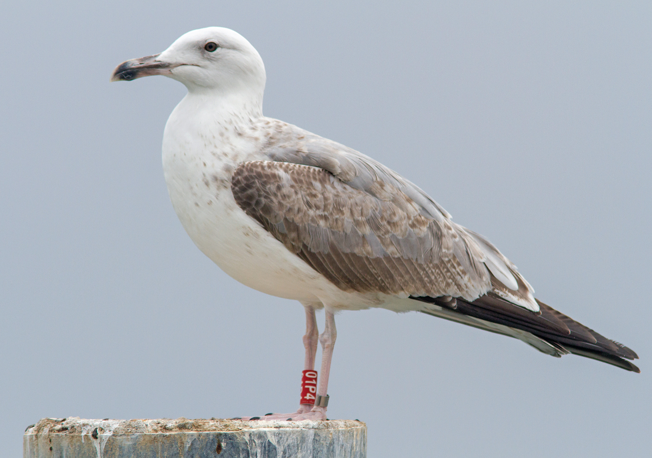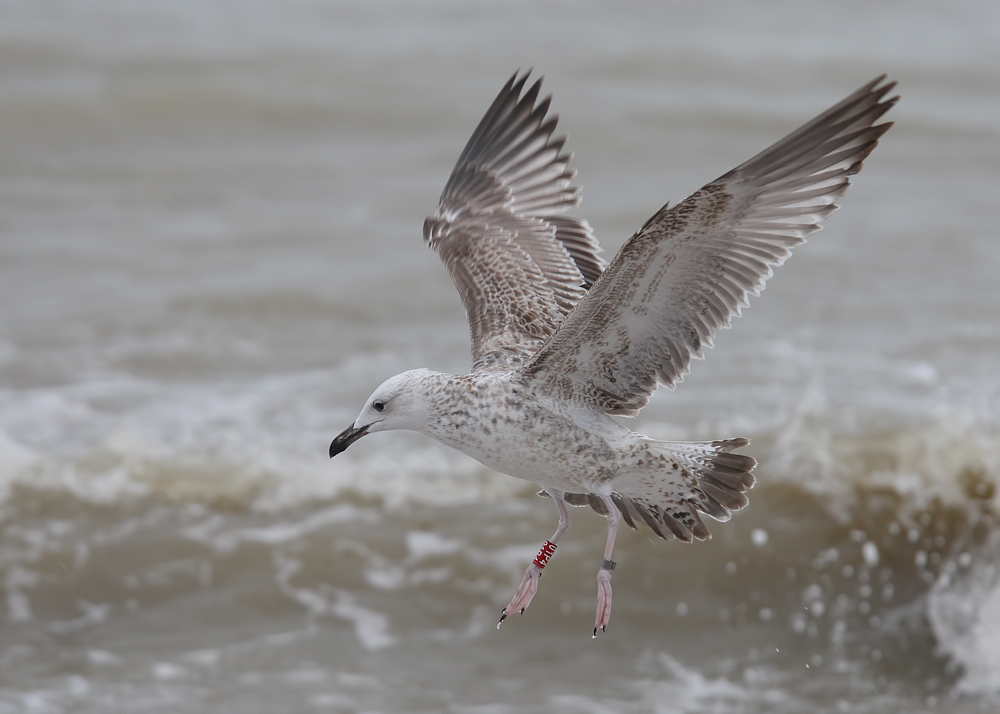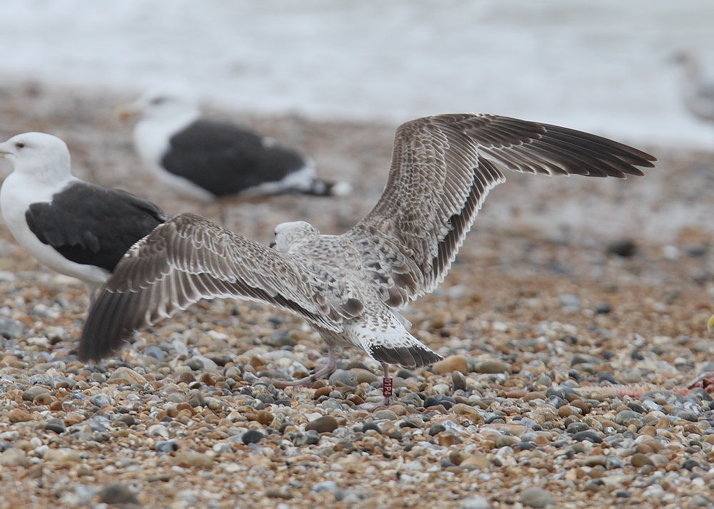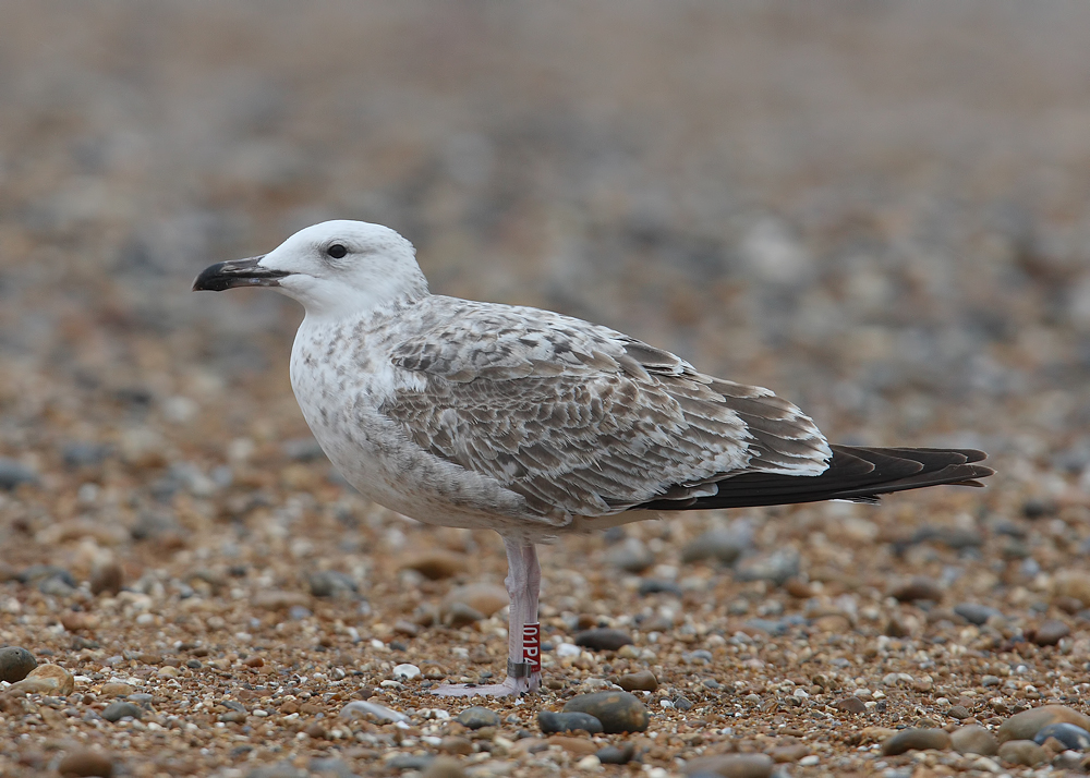 Larus cachinnans 1CY-2CY 01P4 October 2014 & November 2015, UK & Switzerland. Picture: Michael Southcott & Laridoprout. Red ring from Poland used in 2014. 300 pulli were ringed this year here. Ringing data: ringed as pullus on May 15 2014 at the Kozielno colony, Paczkow, Poland; by Jacek Betleja. Larus cachinnans 1CY 01P4 October 04 2014, Dungeness, Kent UK. Picture: Michael Southcott. Visit Michael's Blog: birding the day away! By October, some lower scapulars still juvenile, as are the coverts and tertials. Messy pattern on 2nd gen scaps, with kind of serrated edges of dark centres and transversal bars.