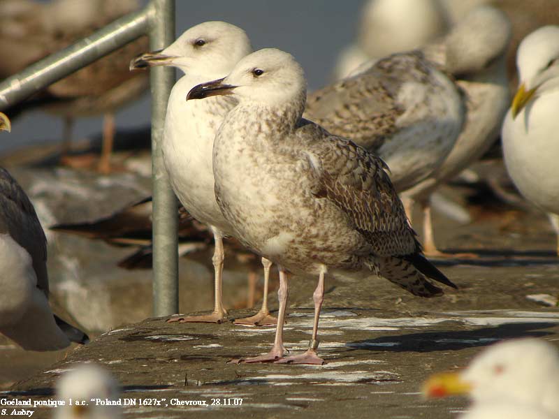Larus cachinnans 1CY PLG DN-1627x November 28 2007, Chevroux, Swizerland. Picture: Stephen Aubry. Bird ringed PLG DN-1627x, probably ringed as pullus on June 10 2007 at Kozielno Paczkow Opolskie Poland. Visible coverts still juvenile, but maybe inner coverts or upper tertials included in post-juvenile moult. |