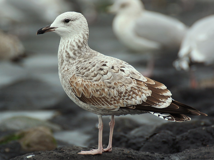 Larus cachinnans 1cy, November 03 2007, Westkapelle, the Netherlands. Picture: Ies Meulmeester. A small 1cy Caspian Gull. Note the very small build, slender bill and very short wings. A lot of median and lesser coverts are dropped and some are recently replaced by second generation coverts. Note the barring on the (inner) greater coverts. The outermost rectrice on the left-side is renewed by a second generation feather. Nearly all under-wing coverts and the axillary feathers are dark fine marked. Note the typical inner primary pattern, note also the very pale tips on the inner webs of p2-p4 and the 'apical spots' on these primaries. |